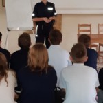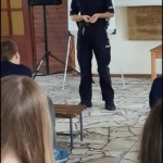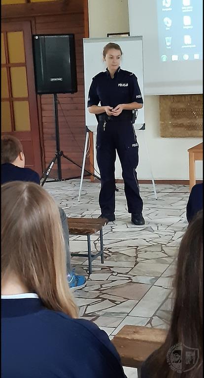 W czasie prelekcji przedstawiciel policji poinformował młodzież o zagrożeniach współczesnego świata oraz o konsekwencjach wynikających z nieprzestrzegania prawa.