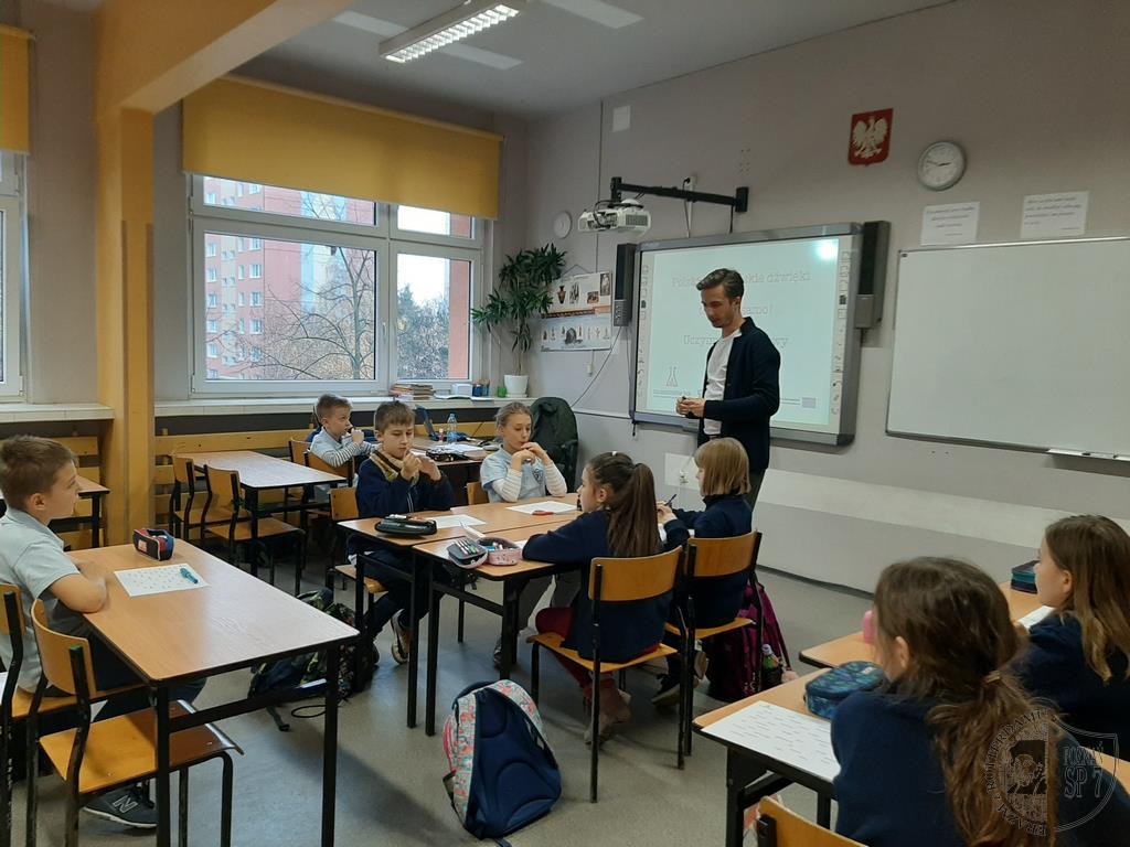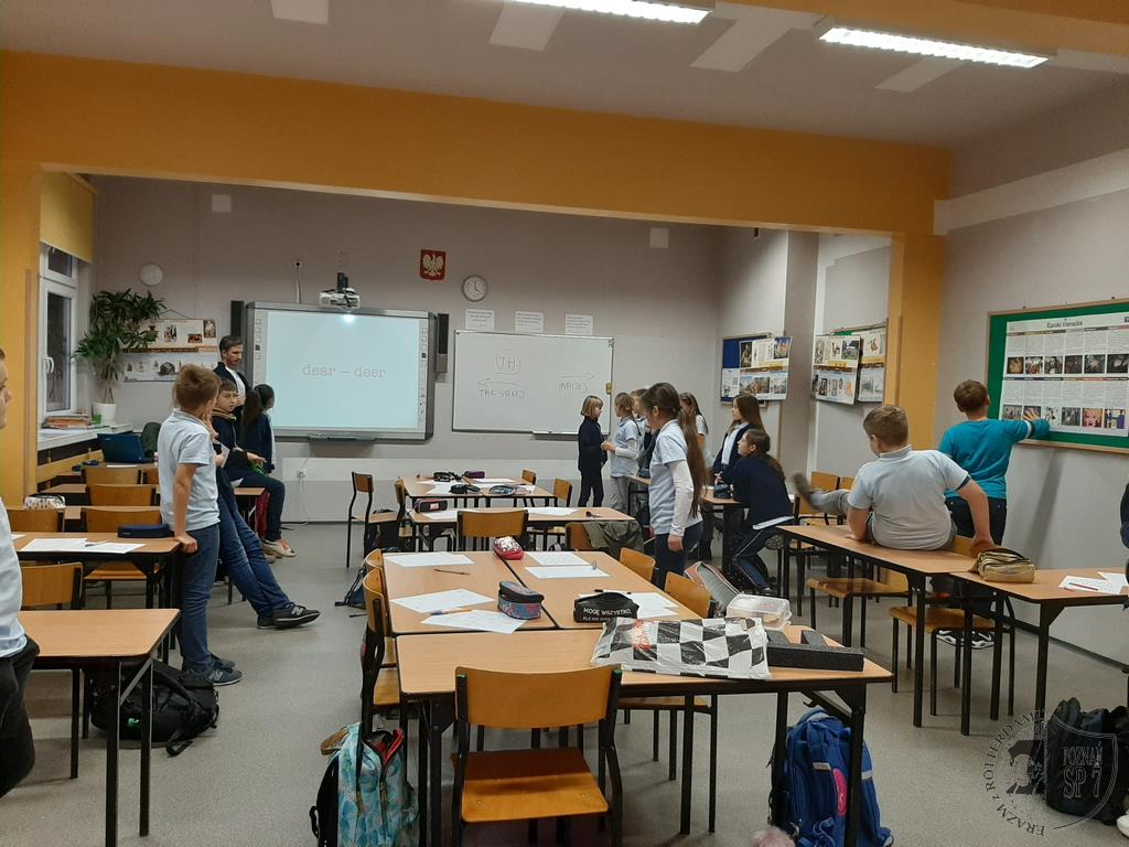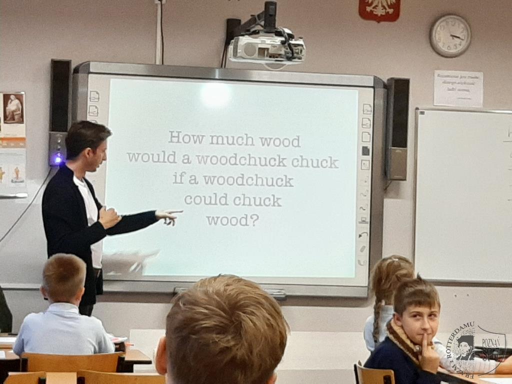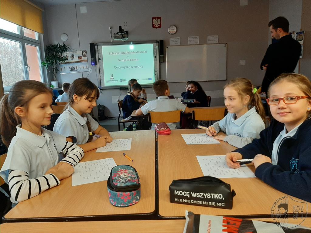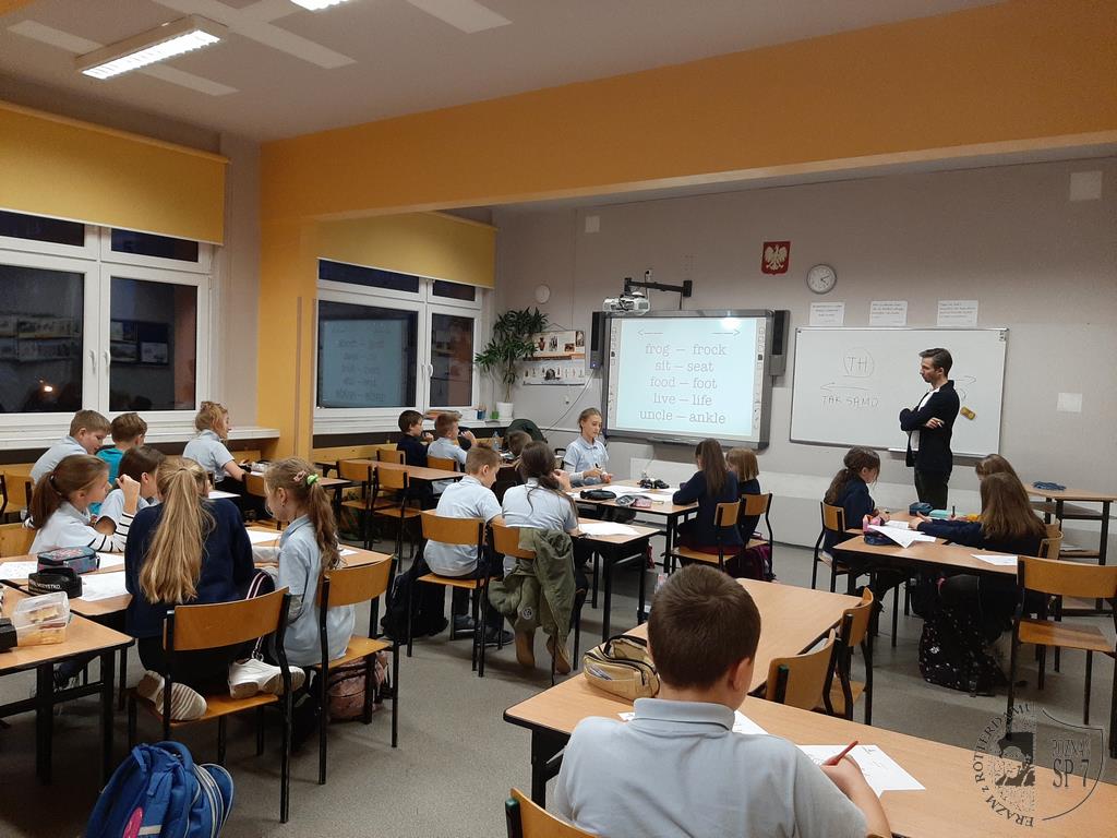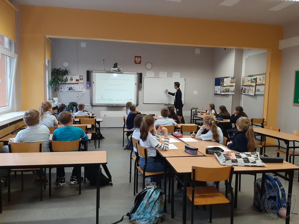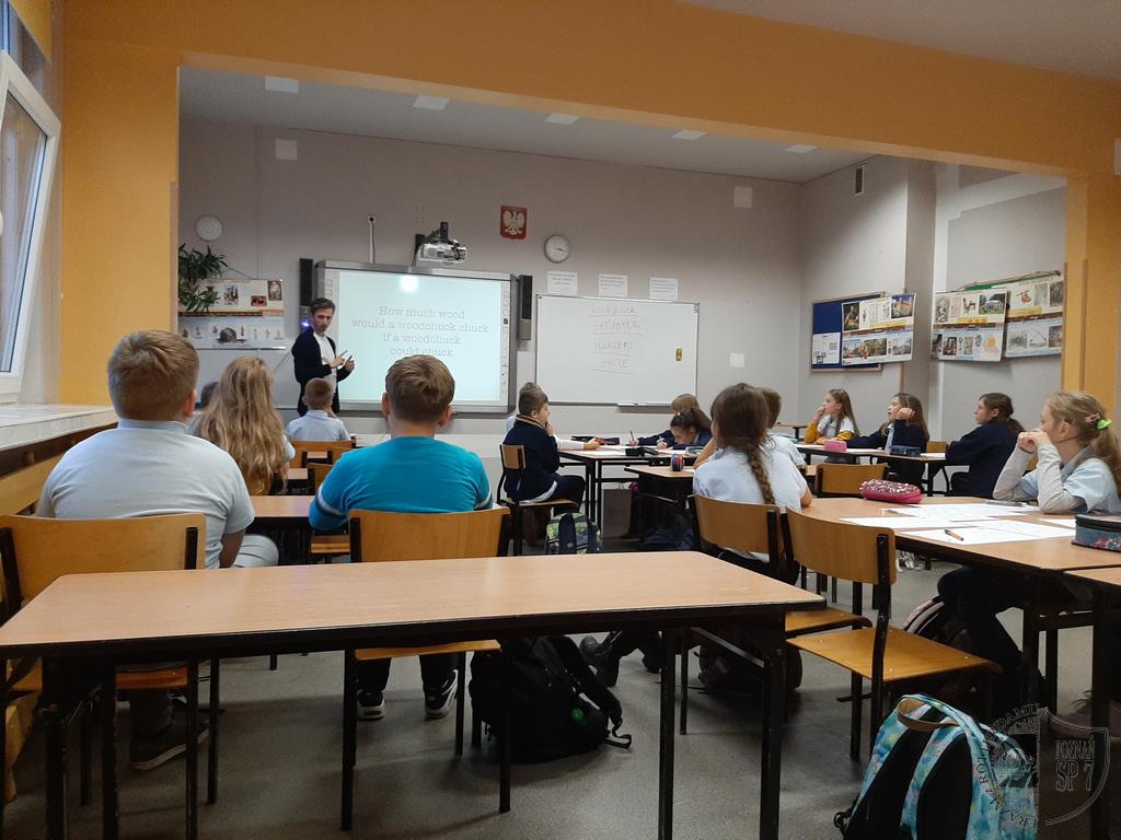 W poniedziałek 18 listopada 2019 r. odbyły się kolejne zajęcia z projektu Be English dla klas piątych, który realizuje Nasza szkoła. Gościliśmy doktoranta Wydziału Anglistyki Uniwersytetu im. Adama Mickiewicza w Poznaniu, Pana Marcina Markowicza. Tematem warsztatu była skomplikowana angielska wymowa Polskie i angielskie dźwięki to nie to samo! Uczymy się wymowy. Uczniowie dowiedzieli się min. o podstawowych różnicach akcentu brytyjskiego i amerykańskiego, poznali popularne łamańce językowe, a także przećwiczyli i nauczyli się rozróżniać najtrudniejsze angielskie dźwięki, które nie mają swoich odpowiedników w języku polskim. Z niecierpliwością czekamy na grudniowe warsztaty, które będą poświęcone kulturze krajów anglojęzycznych.