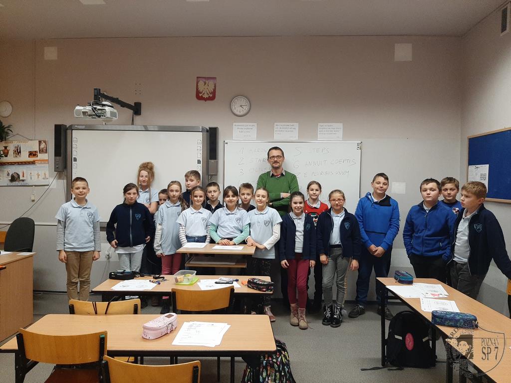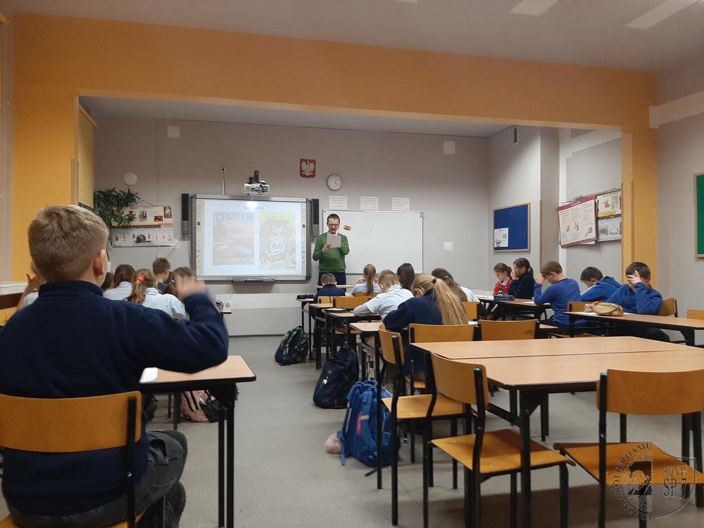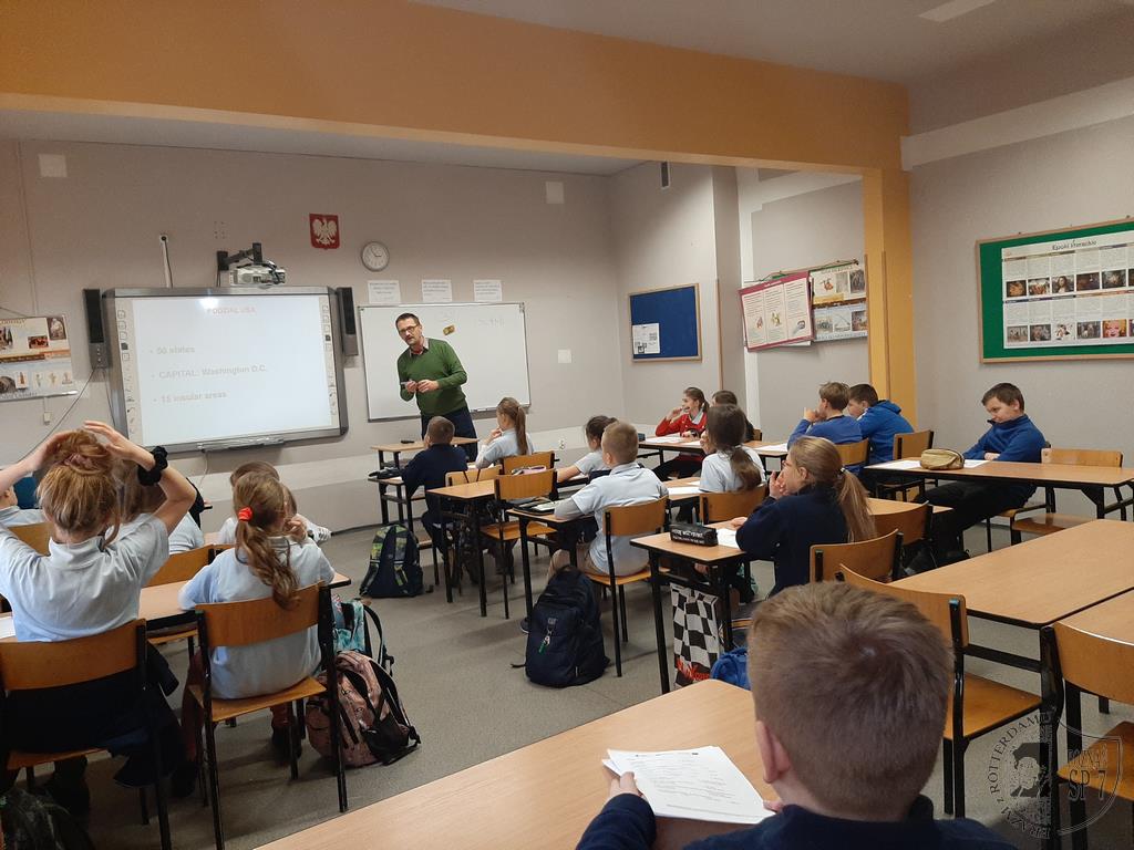 W poniedziałek 9 grudnia 2019 r. odbyło się trzecie warsztatowe spotkanie z projektu Be English dla klas piątych, który realizuje nasza szkoła. Tym razem gościliśmy wykładowcę Wydziału Anglistyki Uniwersytetu im. Adama Mickiewicza w Poznaniu, Pana dr. Tomasza Skireckiego, specjalistę od historii i kultury krajów anglojęzycznych. Tematem warsztatu były symbole Stanów Zjednoczonych. Uczniowie dowiedzieli się min. ile ludzi zamieszkuje ten kraj, które stany są największe pod względem terytorium i w których zamieszkuje największa liczba ludności, a także jakie są największe miasta na terenie USA. Uczniowie poznali również symbolikę flagi amerykańskiej oraz dowiedzieli się o sławnych zabytkach takich jak Statua Wolności czy Mount Rushmore.