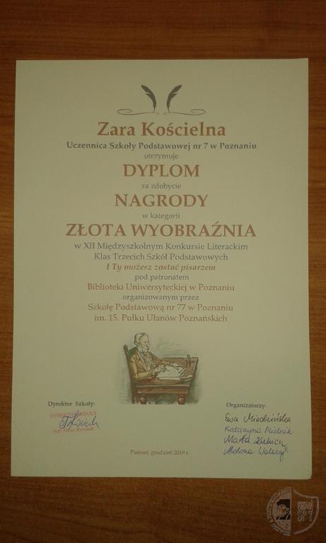 Zara Kościelna została laureatką Międzyszkolnego Konkursu Literackiego w kategorii Złota wyobraźnia.