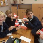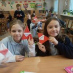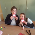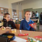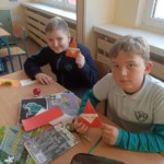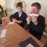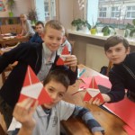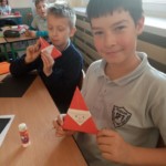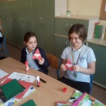 Z kolorowych kartek, w tym głównie białych i czerwonych powstawały trójkąty, kwadraty i prostokąty. Figury składane w odpowiedniej kolejności przyniosły pewną niespodziankę, którą okazał się Mikołaj.