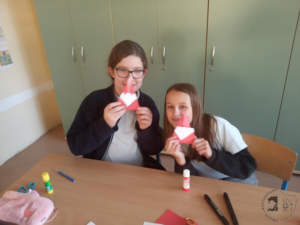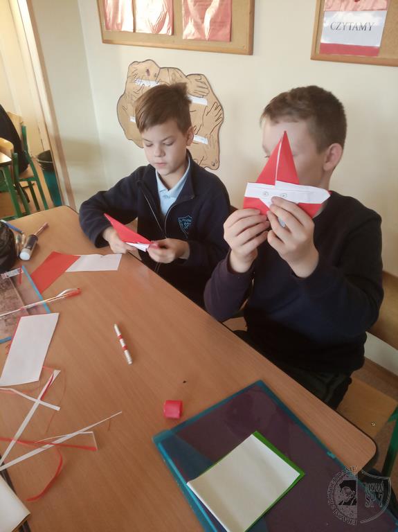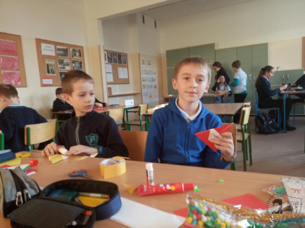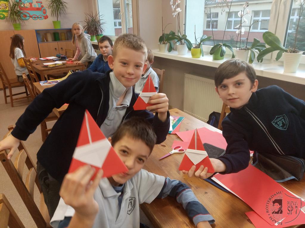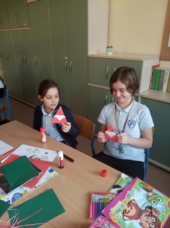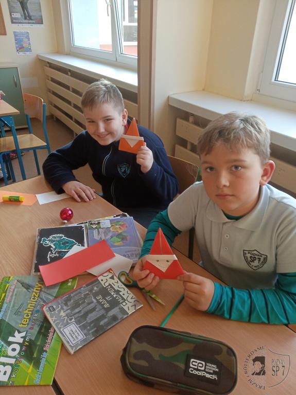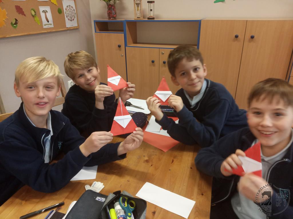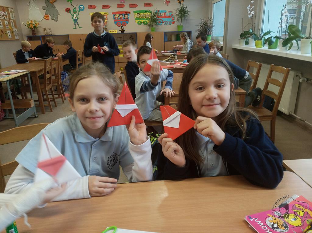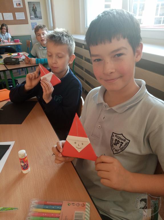 Z kolorowych kartek, w tym głównie białych i czerwonych powstawały trójkąty, kwadraty i prostokąty. Figury składane w odpowiedniej kolejności przyniosły pewną niespodziankę, którą okazał się Mikołaj.