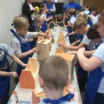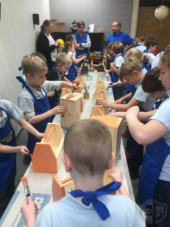 20 lutego wybraliśmy się do Castoramy w Komornikach. Tam, w specjalnie przygotowanym pomieszczeniu czekali na nas pracownicy sklepu i stanowiska, na których leżały ochronne fartuchy i tajemnicze deseczki. Szybko rozszyfrowaliśmy, co będziemy robić. Współpracując ze sobą, każdy z nas przy pomocy młotka i gwoździ wykonał skrzyneczkę, którą później pomalował na wybrany przez siebie kolor.