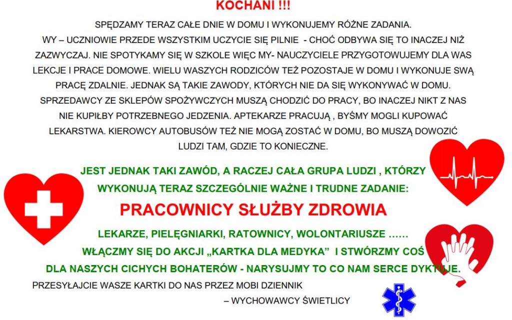 W imieniu nauczycieli świetlicy zapraszam do udziału w akcji „Kartka dla medyka” !