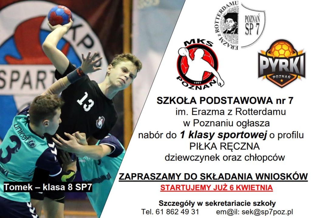 ogłasza nabór do pierwszej klasy sportowej o profilu PIŁKA RĘCZNA dziewcząt i chłopców.
