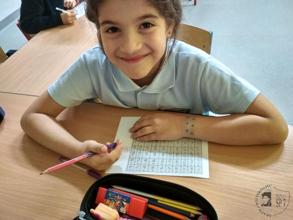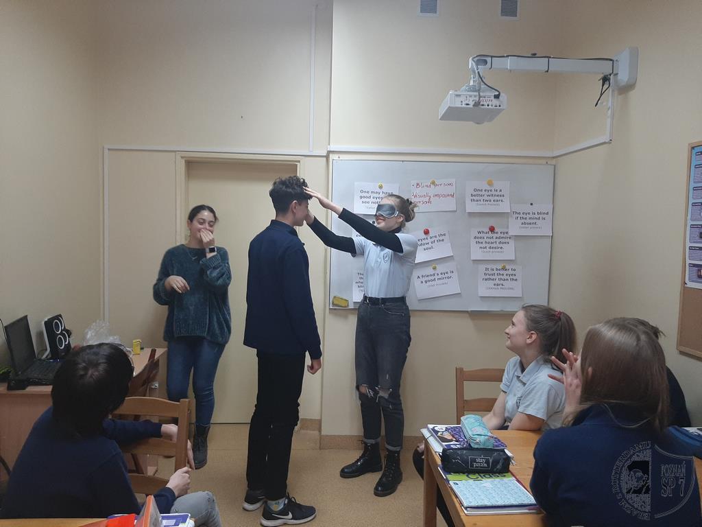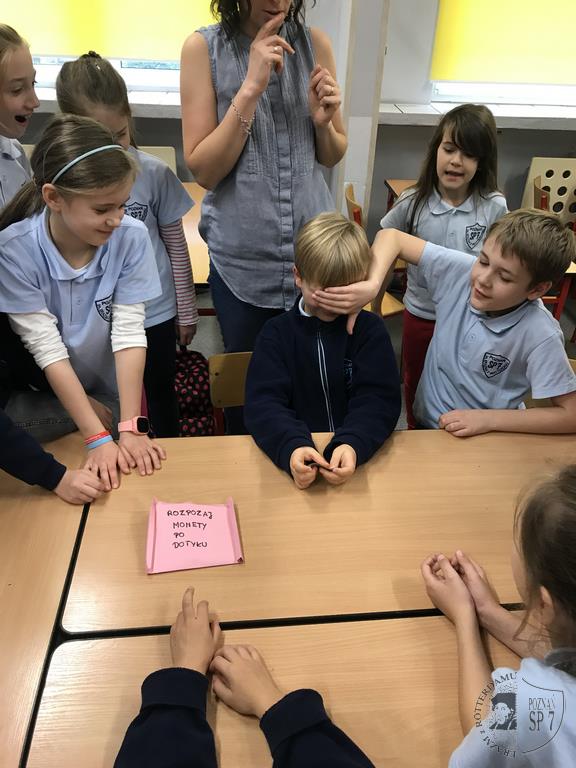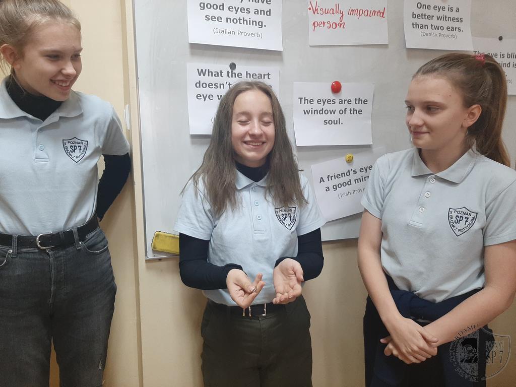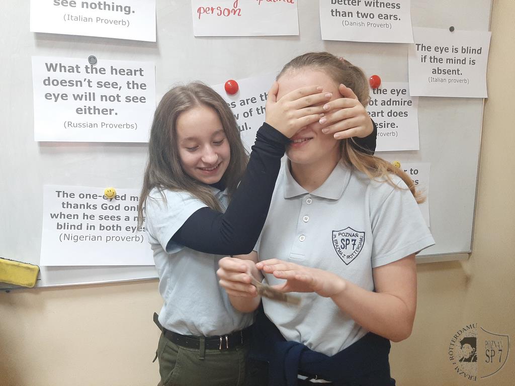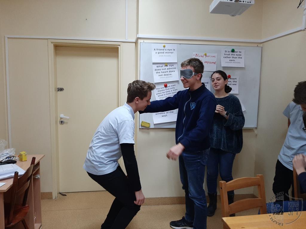 W ramach anglojęzycznych warsztatów uczniowie dyskutowali na temat różnorodnych przysłów z zakresu podejmowanego tematu, rozpoznawali wartość pieniędzy po dotyku, pisali wiadomości używając alfabetu Brailla czy próbowali dotrzeć do wskazanego miejsca z opaską na oczach. Udział w kampanii miał przede wszystkim uwrażliwić naszych uczniów na problemy osób niewidomych i słabowidzących.