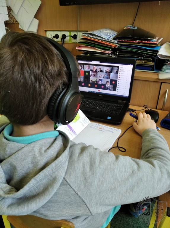 Od kilku tygodni pracujemy wszyscy zdalnie, nawet dzieci z najmłodszych klas, ale to nie oznacza, że szkoła jest zupełnie pusta. Już choćby w salach na parterze toczy się ( oczywiście w reżimie sanitarnym ) szkolne życie.