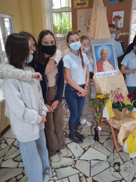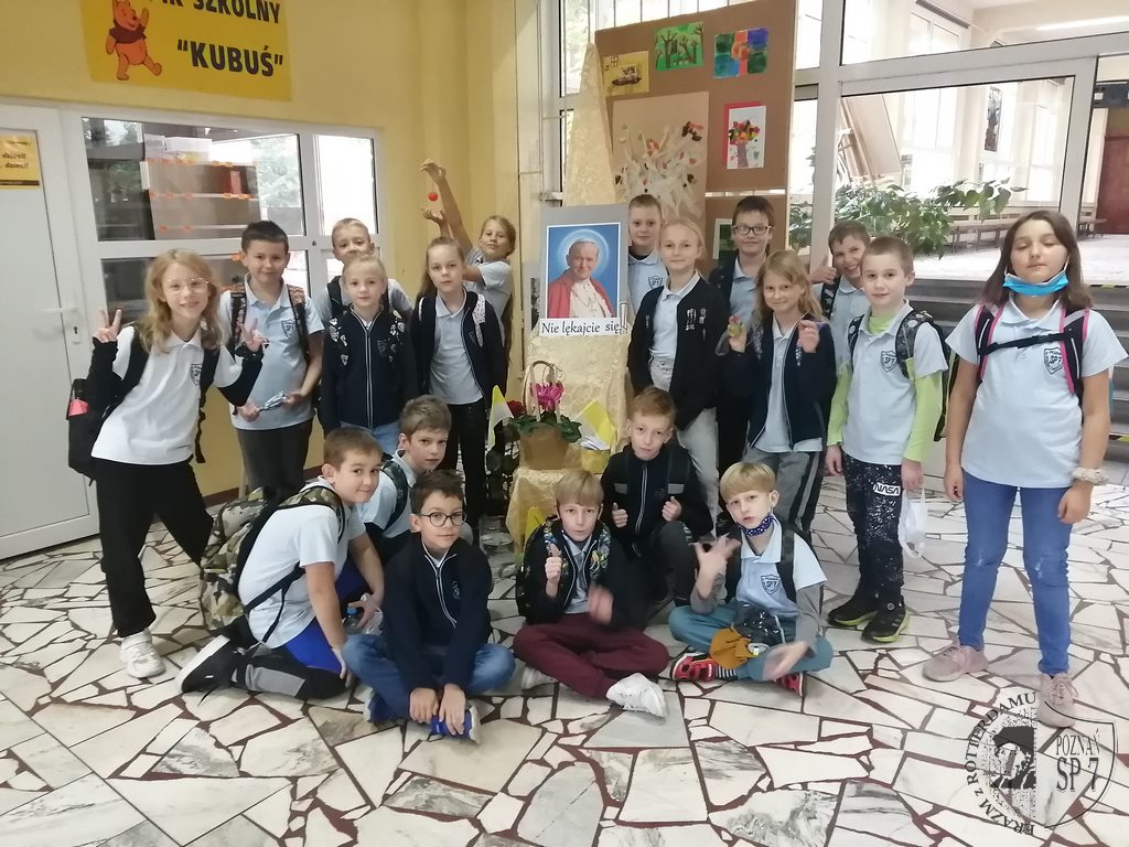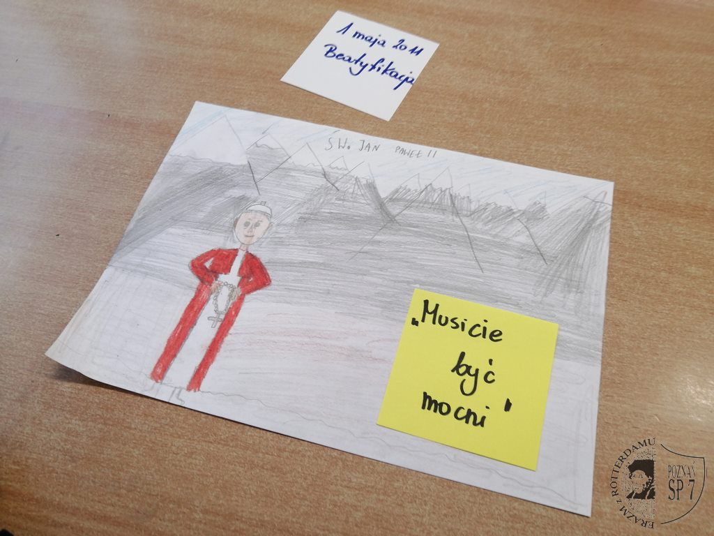 I jeszcze najmłodsi uczniowie wspominali najważniejsze wydarzenia z życia i pontyfikatu JP II, utrwalali jego wizerunek, rozmawiali o jego zainteresowaniach i słuchali ulubionych piosenek oraz wykonali prace plastyczne na temat: z czym kojarzy nam się Jan Paweł II