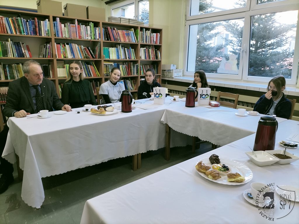 Spotkanie zakończyło się herbatą z ciasteczkami oraz ciekawą rozmową z naszymi gośćmi. Pan profesor okazał się niezwykle barwnym gawędziarzem.