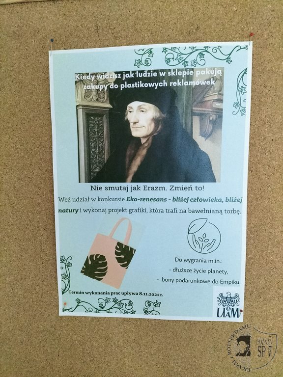Miło nam poinformować, że w czwartek 16 grudnia zostały wręczone nagrody w Konkursie Ekorenesans bliżej człowieka, bliżej natury realizowanym przez Wydział Historii UAM w Poznaniu oraz Szkołę Podstawową nr 7 w Poznaniu w ramach naszej szkolnej innowacji pedagogicznej dla klas 4-8 pt. Złoty wiek. Aby wziąć udział w tym Konkursie należało zaprojektować logo związane z renesansem, które miało pojawić się na torbie materiałowej.