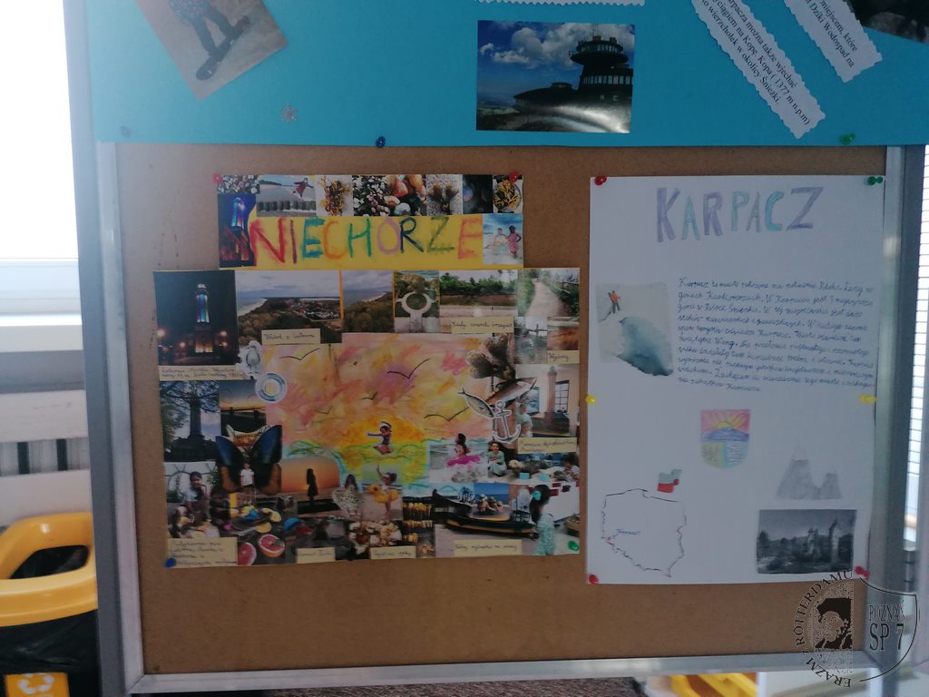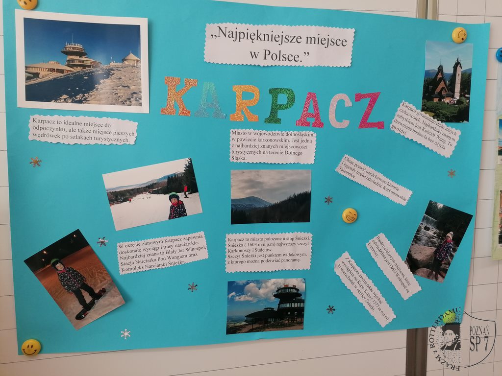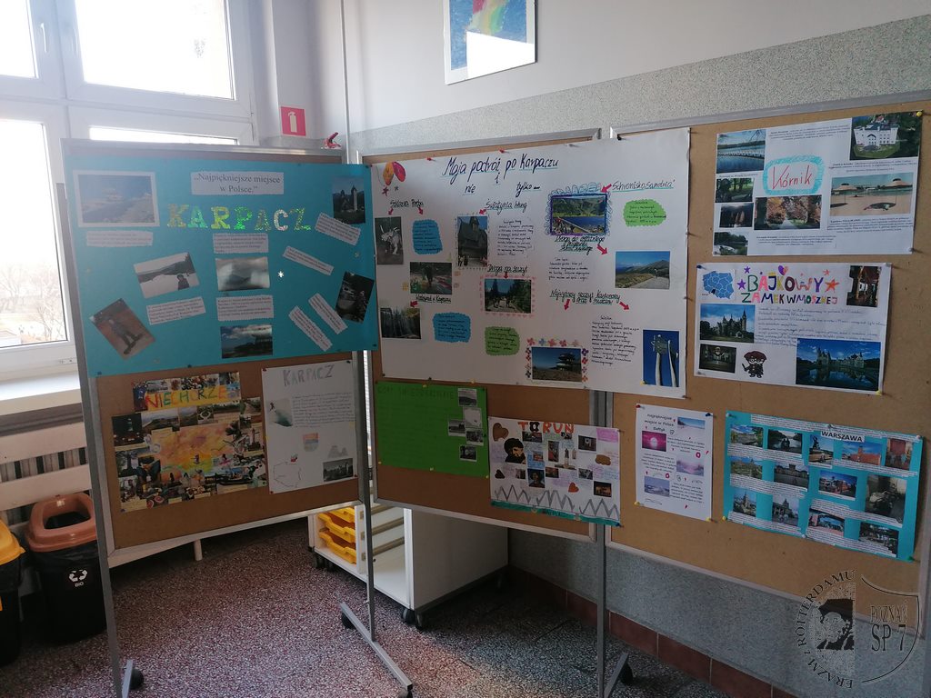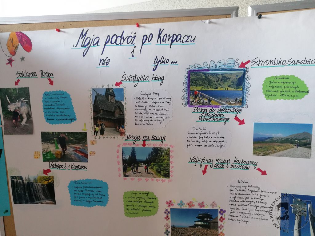 Na początku marca uczniowie klasy 3b pracowali wokół bloku Podróżujemy po Polsce. Przemierzyliśmy nasz kraj z północy na południe oraz ze wschodu na zachód. Poznaliśmy krainy geograficzne, regiony naszego kraju i ciekawe zakątki. Wiemy już, co to są pomniki przyrody , parki narodowe i rezerwaty przyrody. Potrafimy je wymienić i podać nazwy zwierząt i roślin, które są w nich chronione. Wiemy także jak ważna jest ochrona przyrody i co należy zrobić, aby zadbać o nasze najbliższe otoczenie oraz całe środowisko. Pracowaliśmy z mapą i niestraszne nam znalezienie na niej, najstarszych miast czy najpiękniejszych zamków w Polsce. Doskonale wiemy, czym różni się zamek od pałacu. Każdy z nas wie, co oznaczają kolory na mapie. Najbardziej jednak spodobało nam się zadanie, które było podsumowaniem naszej pracy. Każdy z nas mógł wybrać sobie miejsce ciekawe turystycznie i przygotować prezentację na jego temat w postaci plakatu. Musieliśmy to miejsce zareklamować w taki sposób, aby każdy z nas chciał je odwiedzić. Okazało się, że najwięcej osób wybrało góry, a szczególnie Karkonosze. Wiemy, że w naszym kraju jest dużo pięknych miejsc, a jeszcze więcej takich, które warto zobaczyć. Weźmiemy to pod uwagę w naszych wakacyjnych planach.