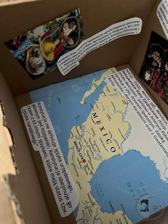 Pudełka wypełnione zostały informacjami z zakresu geografii fizycznej i geografii społeczno-gospodarczej oraz ciekawostkami, którymi w interesujący sposób można dzielić się z innymi uczniami. Siódemkowiczom nie zabrakło kreatywności!