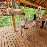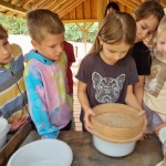 Następnie przyszedł czas na mielenie zboża w stępach. Okazało się, że to bardzo ciężka praca. Uczniowie przesiewali zmieloną mąkę przez specjalne sita i tak samodzielnie przygotowaną pamiątkę zabrali do domu.