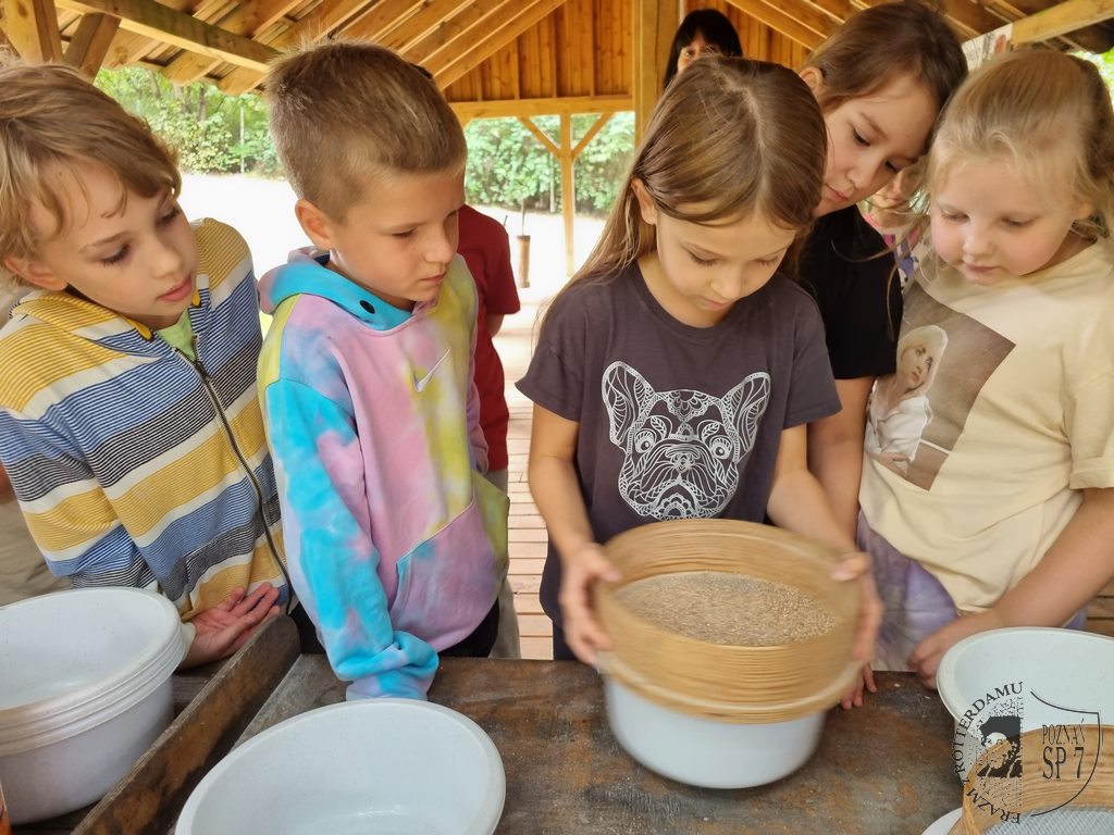 Następnie przyszedł czas na mielenie zboża w stępach. Okazało się, że to bardzo ciężka praca. Uczniowie przesiewali zmieloną mąkę przez specjalne sita i tak samodzielnie przygotowaną pamiątkę zabrali do domu.