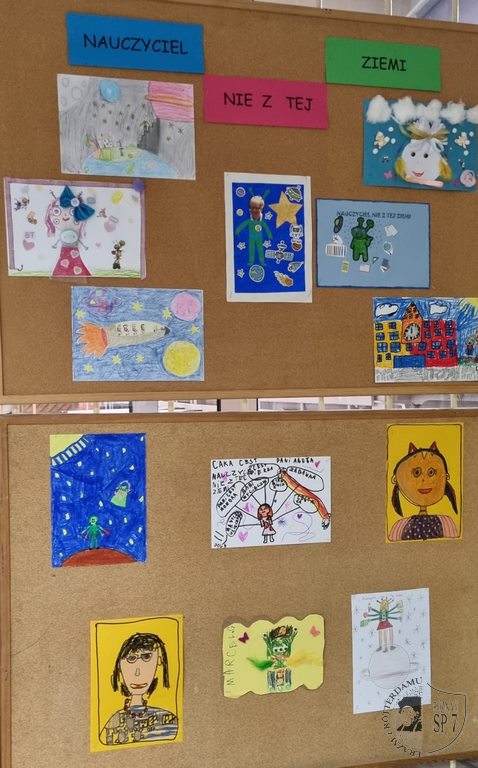 Oba dotyczyły Dnia Edukacji Narodowej. Przedstawiciele MSU pomogli wychowawcom stworzyć listy dzieci, które wzięły udział w Giełdzie Talentów 14 października, a także poprosili swoje koleżanki i kolegów z klas o wykonanie pracy plastycznej pt. Nauczyciel nie z tej ziemi. Powstałe portrety nauczycieli znalazły się na okolicznościowej wystawie w holu szkoły. Zapraszamy do obejrzenia interesujących prac najmłodszych uczniów naszej szkoły.