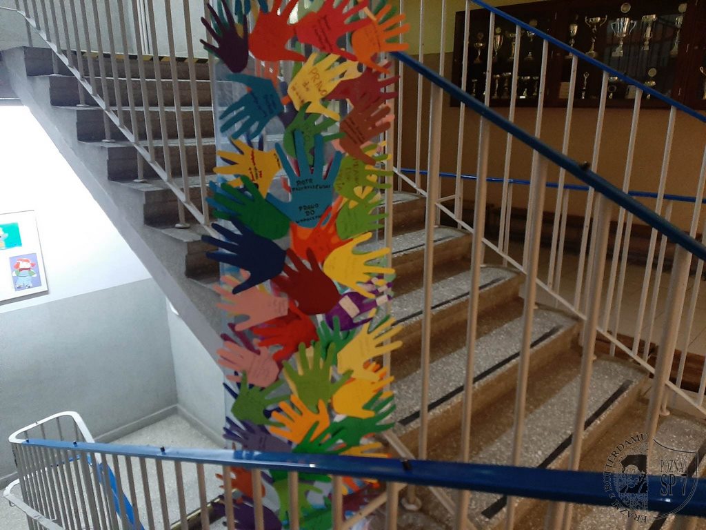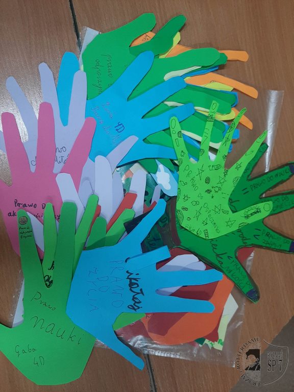 W tym roku to pierwsze święto uczciliśmy stworzeniem własnej formy Konwencji o prawach dziecka. Po omówieniu z wychowawcami praw przysługujących dzieciom wybraliśmy te najważniejsze dla nas i napisaliśmy je na odciskach naszych dłoni. Wszystkie te kolorowe, wycięte z papieru rączki udekorowały naszą szkołę. Konwencja o prawach dziecka uchwalona 20 listopada 1989r. miała formę dokumentu, za to nasza Siódemkowa jest kolorowa i rozciąga się od II pietra do parteru. Przypomina nam każdego dnia, że dzieci mają głos i są ważne.