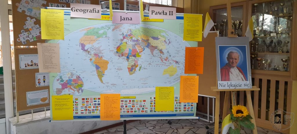 Dzień Papieski upłynął w naszej szkole 16 października, ale jeszcze przez kilka dni trwał konkurs pt. Geografia Jana Pawła II. Sprawdzaliśmy wiedzę i pamięć uczniów z klas 6-8. Nasi uczniowie mieli do zapamiętania i wskazania, aż 129 krajów, do których pielgrzymował Jan Paweł II podczas swego 27-letniego pontyfikatu.