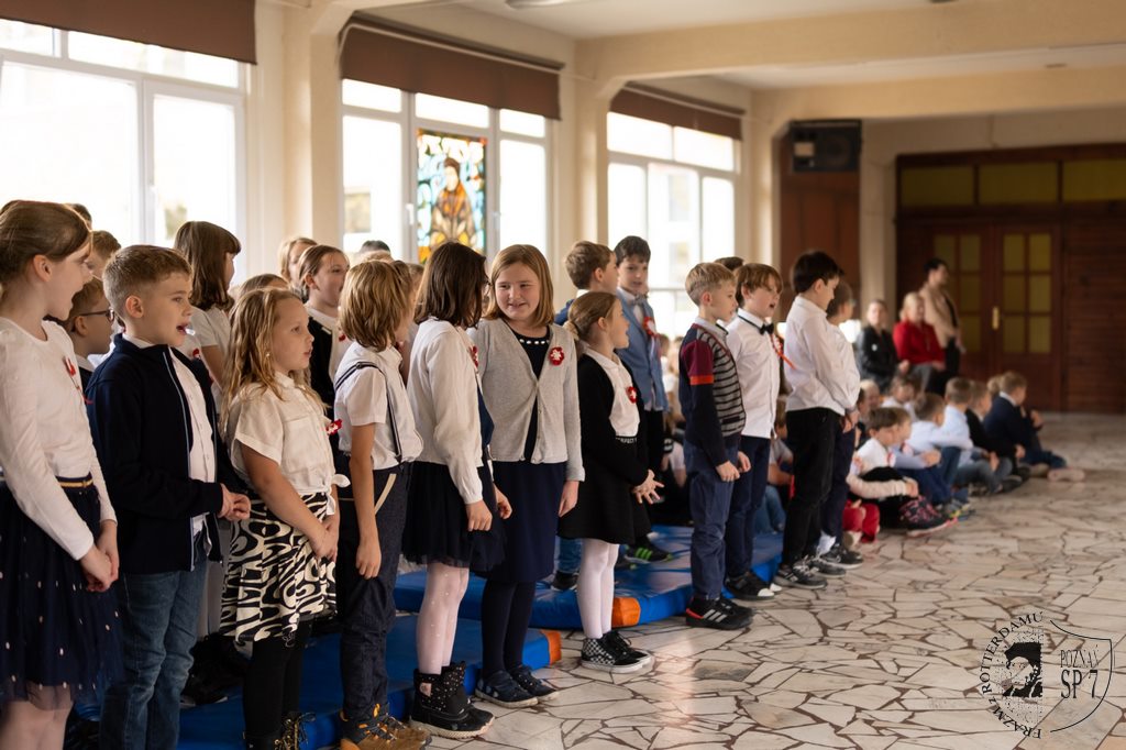 9 listopada najmłodsi uczniowie naszej szkoły wzięli udział w uroczystym apelu z okazji Narodowego Święta Niepodległości. Spotkanie zostało przygotowane i poprowadzone przez przedstawicieli Małego Samorządu Uczniowskiego. Wspomnienia ważnych wydarzeń z historii Polski przeplatane były pięknymi pieśniami patriotycznymi, które wspaniale zaprezentowały dzieci z poszczególnych klas. O trudnych i bolesnych, ale także radosnych kartach z dziejów Polski mówiły wiersze, proza oraz obrazy prezentacji.