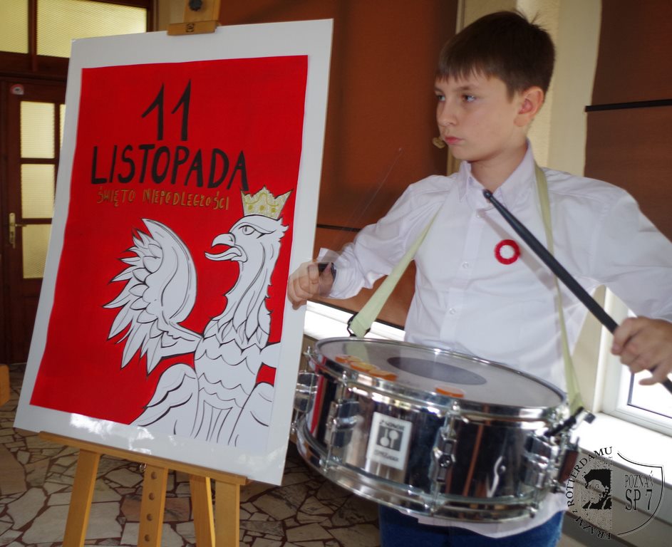 10 listopada odbyły się apele z udziałem uczniów starszych klas. Wspominaliśmy w nich ten jakże trudny czas w historii naszego kraju, ostatecznie zakończony polskim zwycięstwem. W obecności Dyrekcji Szkoły i Grona Pedagogicznego przedstawiciele poszczególnych klas (4-8) zaprezentowali sylwetki postaci, które walczyły o naszą wolność i przyczyniły się do odzyskania niepodległości. Wśród nich znaleźli się między innymi tacy patrioci, jak: Józef Piłsudski, Roman Dmowski, Ignacy Jan Paderewski, Józef Haller, Ignacy Daszyński, czy Józef Wybicki. Oprócz polskiego hymnu Mazurka Dąbrowskiego, mieliśmy także okazję wspólnie zaśpiewać pieśni patriotyczne, między innymi: Pierwszą kadrową, która była ulubioną pieśnią marszałka Józefa Piłsudskiego, czy Przybyli ułani. Uczestników apelu do śpiewu żywo porwała Szara piechota, której tekst jest naszym uczniom bardzo dobrze znany. Pięknej oprawy i uroczystego nastroju Siódemkowiczom dodawały stroje galowe z przypiętymi do piersi kotylionami.