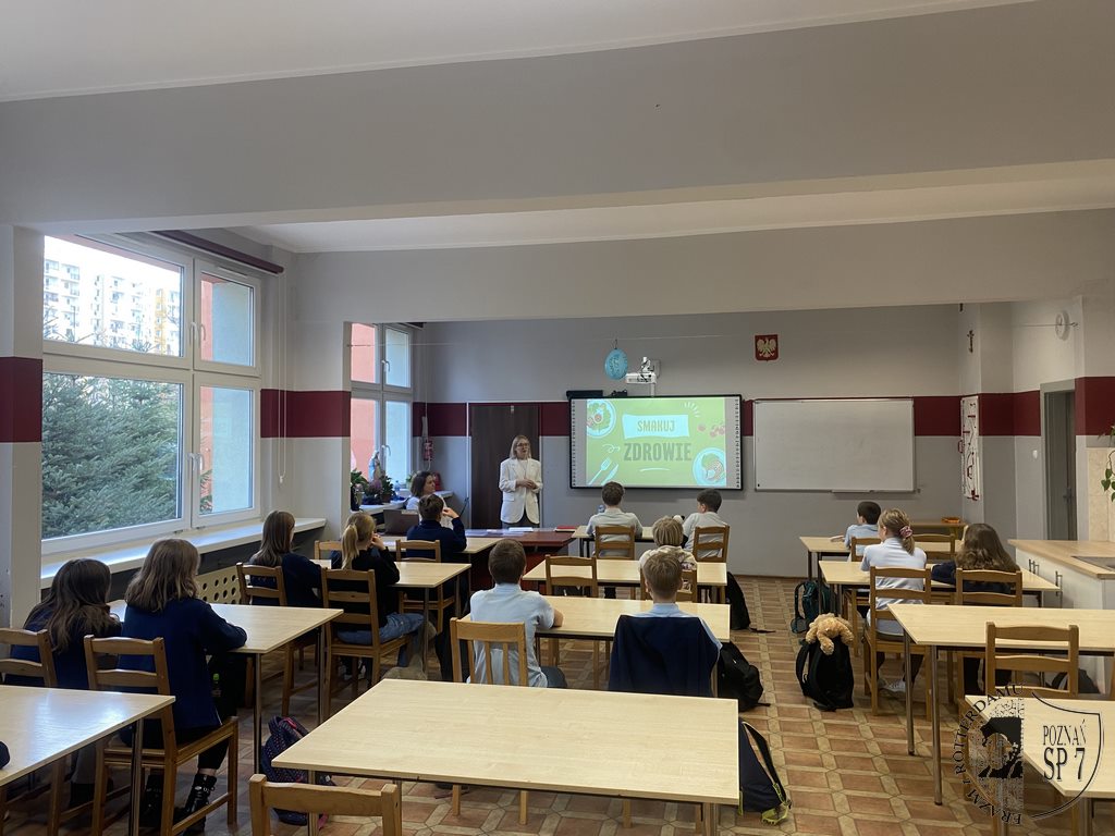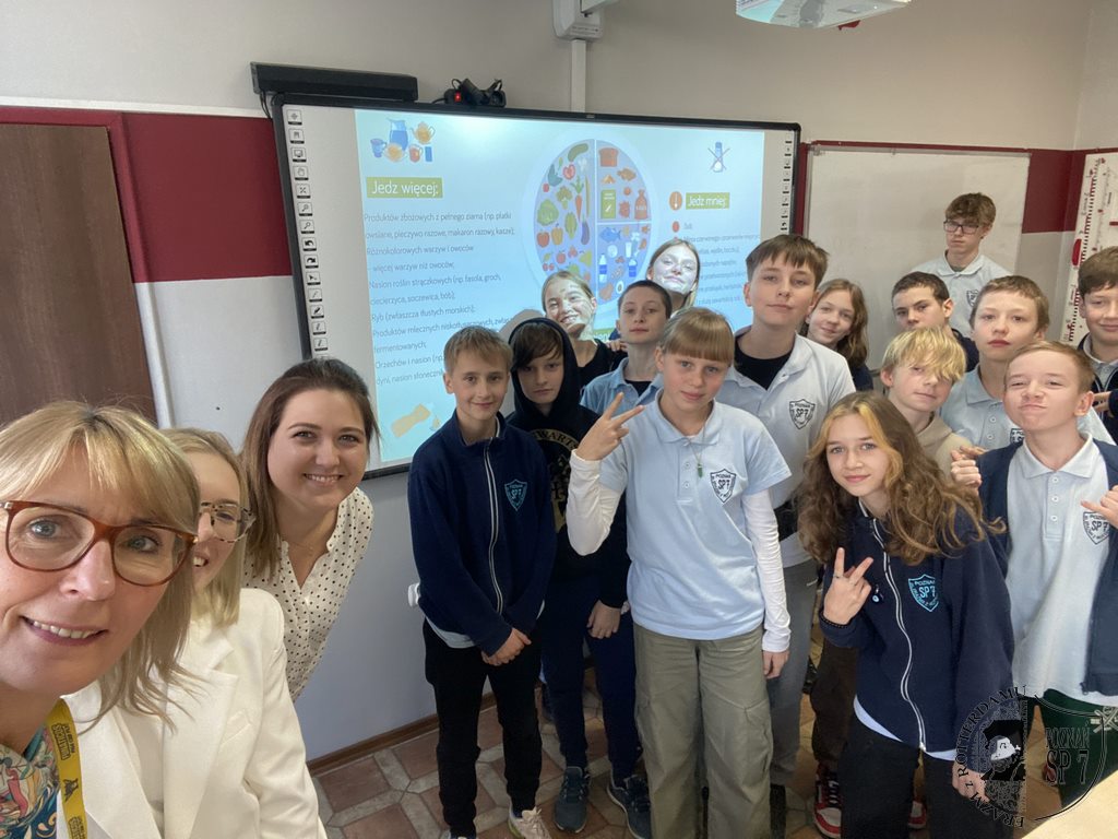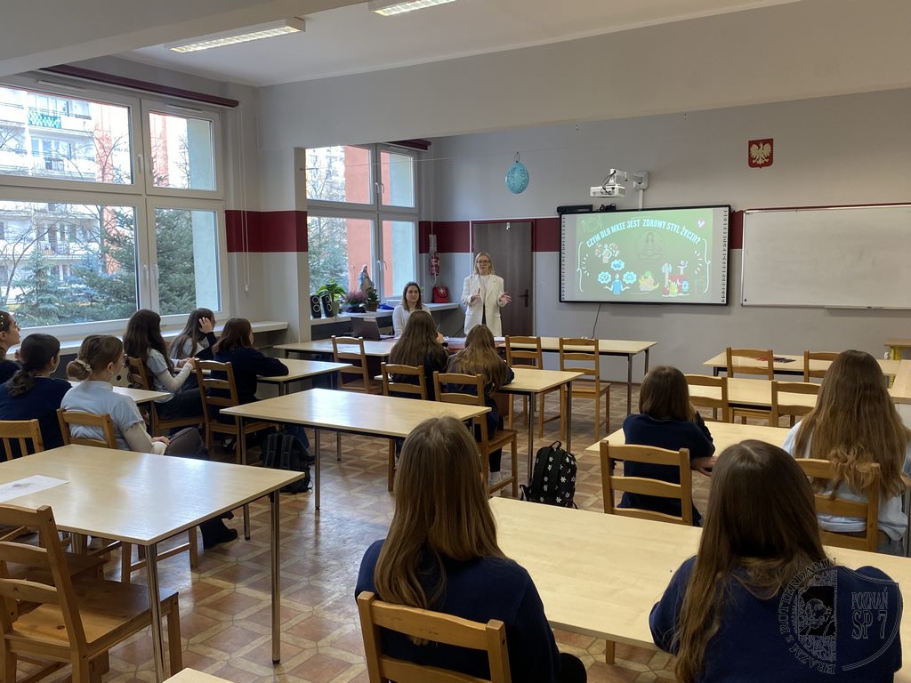 Martyna i Natalia przybliżyły uczennicom klasy 8c i uczniom klasy 6a elementy edukacji żywieniowej, zarówno w zakresie zaleceń zdrowego żywienia, kształtowania właściwych nawyków żywieniowych, walorów i zasadności zdrowego śniadania, jak i zwiększenia świadomości dotyczącej wpływu aktywności fizycznej i żywienia na zdrowie.