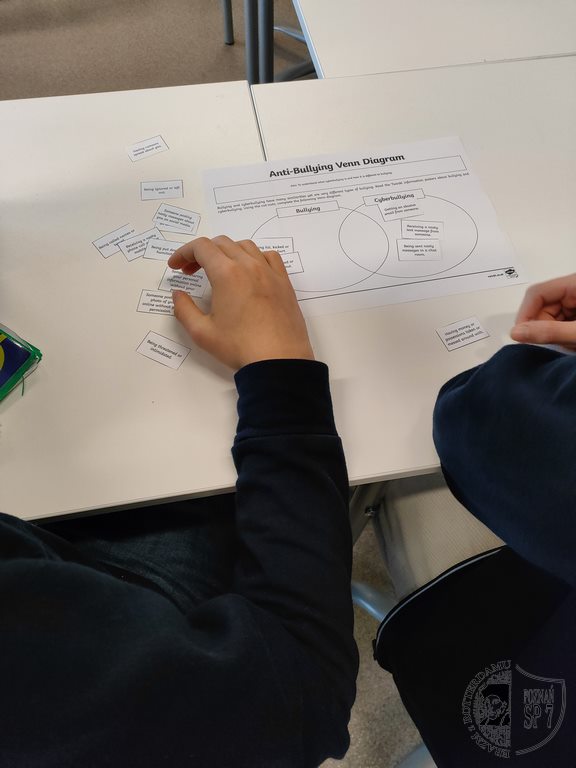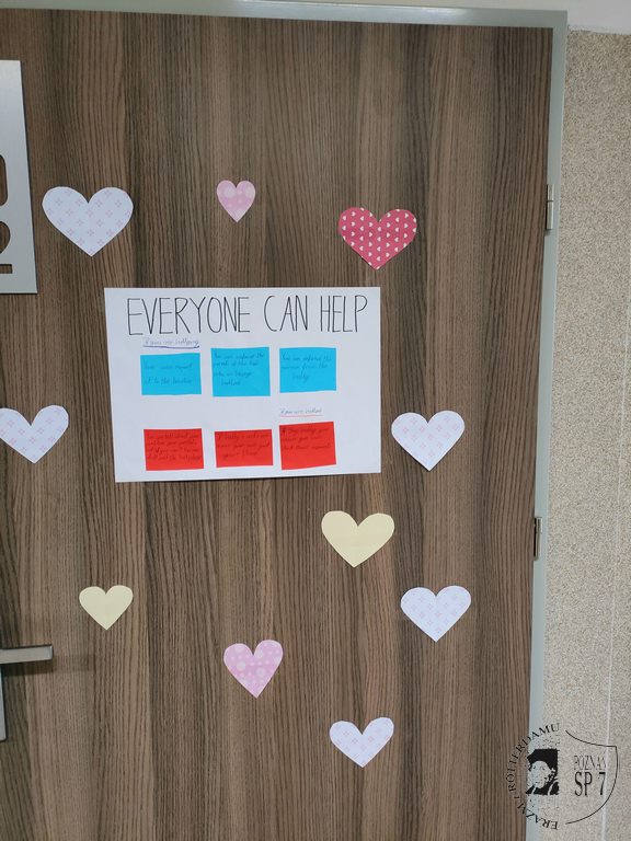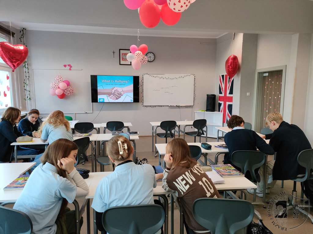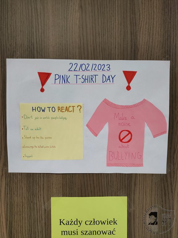 Zainspirowani kanadyjską inicjatywą o nazwie Pink Shirt Day (Dzień Różowej Koszulki) w ostatnim tygodniu na lekcjach języka angielskiego rozmawialiśmy o bullyingu (z ang. zastraszanie, znęcanie się nad słabszymi). W 2007 roku w kanadyjskiej szkole nowy uczeń został wyśmiany przez innych za to, że ubrał różową koszulkę. Widząc to, starsi uczniowie, zorganizowali akcję, podczas której rozdali w szkole różowe koszulki, by okazać wsparcie nowemu koledze. Od tamtej pory, każdego roku pod koniec lutego, w szkołach poruszany jest temat bullyingu.