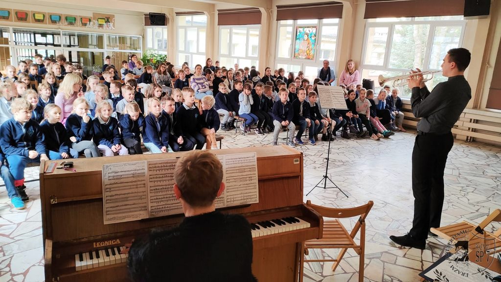 PIĘKNO – podziwialiśmy słuchając koncertu naszych szkolnych talentów, zwinną tancerkę, uzdolnionych wokalistów, szalonych bębniarzy i absolwenta – trębacza Karola Łopińskiego.