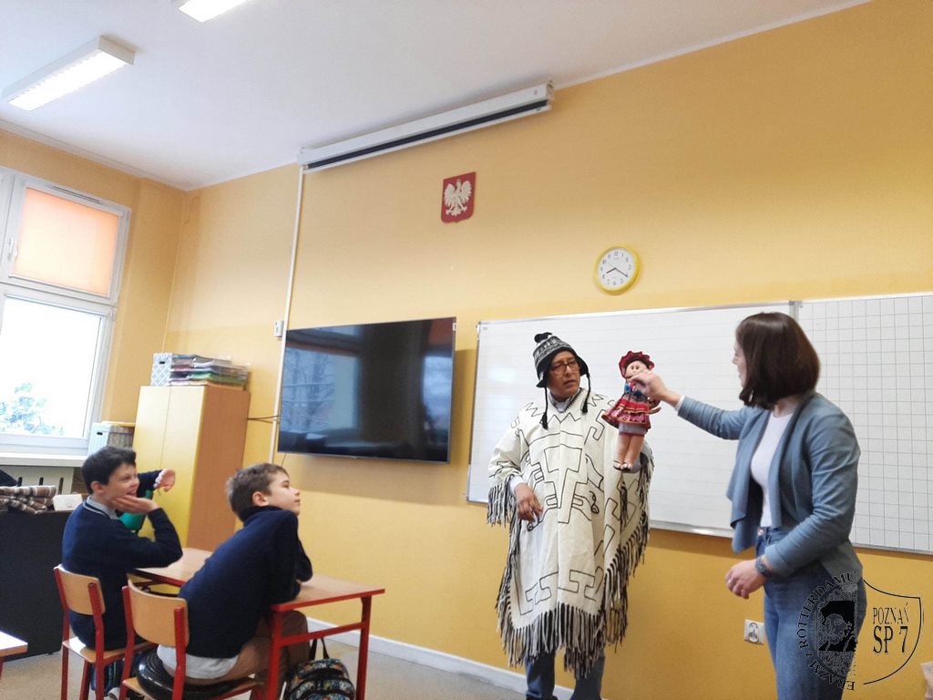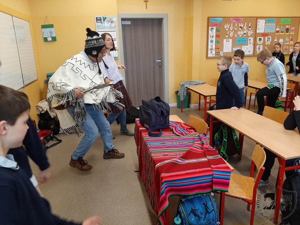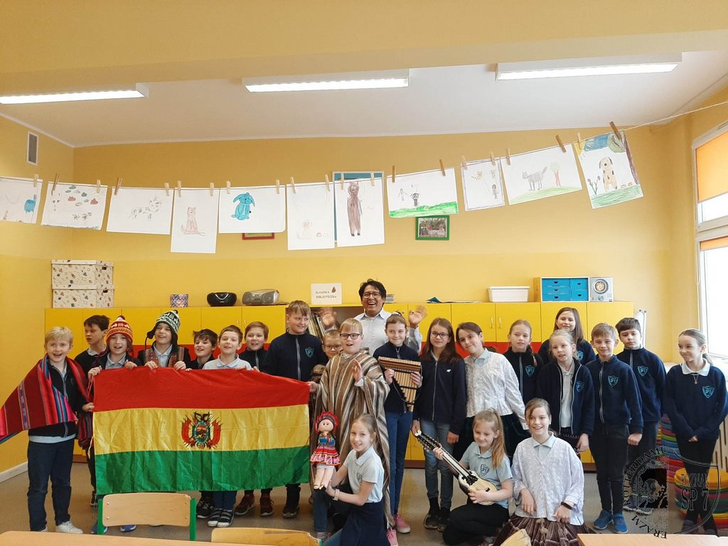 6 marca mieliśmy w naszej klasie niezwykłego gościa. Odwiedził nas pan Carlos, który opowiedział o swojej ojczyźnie – Boliwii, a także zaprezentował tradycyjne stroje oraz instrumenty muzyczne pochodzące z Ameryki Południowej. Spotkanie było okazją do wspólnych śpiewów i tańców. Nauczyliśmy się również kilku słów w języku hiszpańskim. Wizyta pana Carlosa była prezentem dla dziewczynek z okazji zbliżającego się Dnia Kobiet.