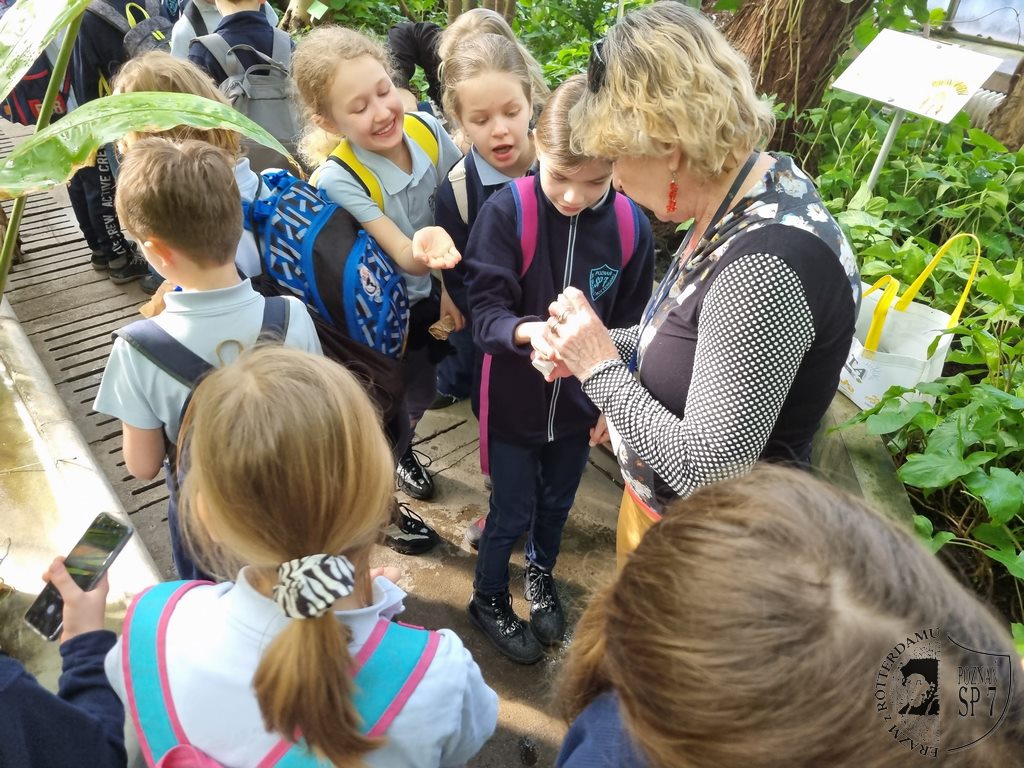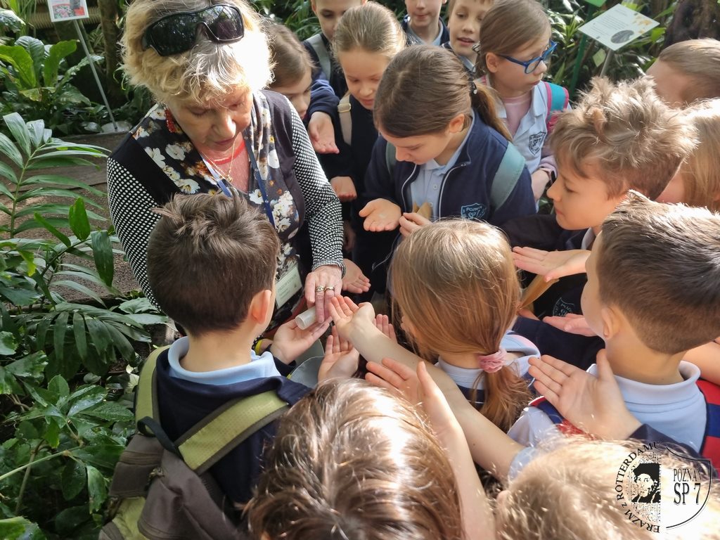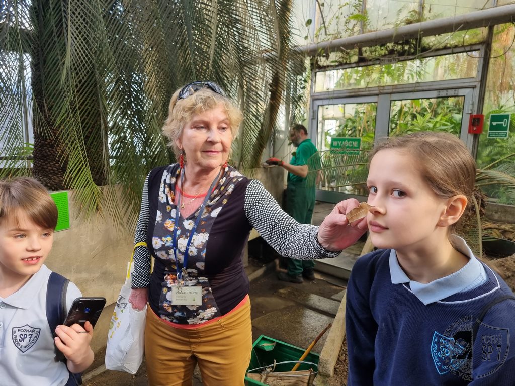 Naszym przewodnikiem była pani Krysia, która w sposób niezwykle ciekawy wprowadziła nas w świat fauny i flory z różnych stref klimatycznych, w tym tropikalnej, subtropikalnej, śródziemnomorskiej. Podczas godzinnego spaceru mieliśmy okazję poznać wiele smaków i zapachów tropików tj. kakaowiec, kokos, awokado, wanilia, aloes, eukaliptus i wiele innych. Przez cały pobytu w Palmiarni towarzyszył nam skrzek papug, które próbowały zwrócić na siebie swoją uwagę.