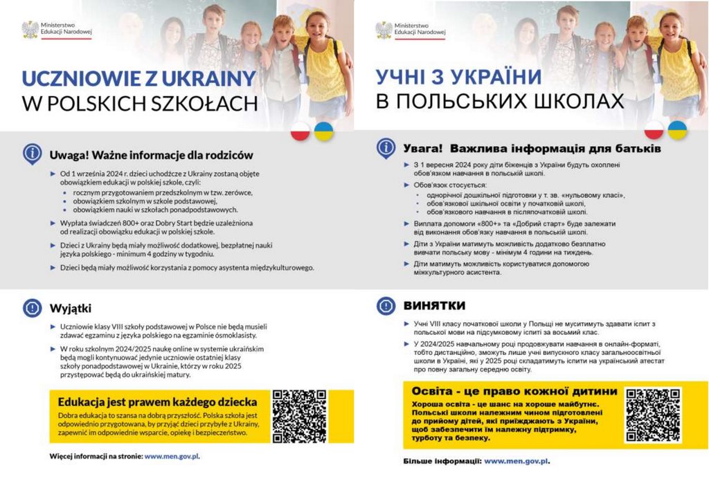 na prośbę Ministerstwa Edukacji Narodowej, przekazujemy informacje nt. obowiązku szkolnego i obowiązku nauki w Polsce dla uczniów z Ukrainy. Od 1 września dzieci i młodzież z Ukrainy zostaną objęci obowiązkiem szkolnym i obowiązkiem nauki. Wielu nowych uczniów rozpocznie naukę w polskich szkołach i w ocenie MEN istotne jest, aby zarówno oni, jak i ich rodziny były świadome nowych przepisów oraz możliwości i szans edukacyjnych, które stoją przed nimi w polskich szkołach.