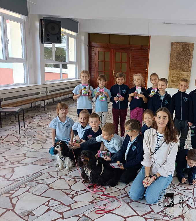 W dniu 16.10.2024r. odbyło się spotkanie klasy 1a z Panią Dogoterapeutką Anną Dankowską oraz dwoma terapeutami rasy Cavalier King Charles Spaniel. Dla dzieci był to niezwykły czas z czworonożnymi terapeutami , którzy w przyjacielski sposób pokazywali swoje kompetencje behawioralne.