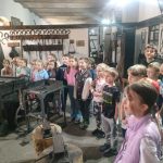 Następnie zwiedziliśmy z przewodniczką muzeum. Odwiedziliśmy po kolei różne pracownie, w których zgromadzone były narzędzia pracy: szewca, kowala, stolarza, pszczelarza. Mieliśmy okazję uderzyć kowalskim młotkiem, wiercić dziurę ręcznym świdrem, heblować deskę, wyjąć ramkę z miodem i odwirować ten miód, prasować żelazkiem z duszą i prać na tarze. Zasiedliśmy także w stuletnich ławkach i poczuliśmy się jak nasi przodkowie. Bardzo ciekawa była ta wędrówka w czasie.