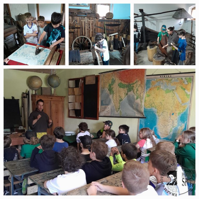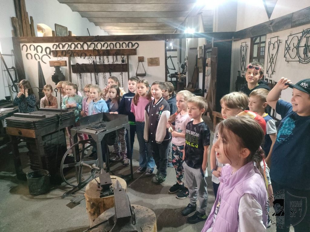 Następnie zwiedziliśmy z przewodniczką muzeum. Odwiedziliśmy po kolei różne pracownie, w których zgromadzone były narzędzia pracy: szewca, kowala, stolarza, pszczelarza. Mieliśmy okazję uderzyć kowalskim młotkiem, wiercić dziurę ręcznym świdrem, heblować deskę, wyjąć ramkę z miodem i odwirować ten miód, prasować żelazkiem z duszą i prać na tarze. Zasiedliśmy także w stuletnich ławkach i poczuliśmy się jak nasi przodkowie. Bardzo ciekawa była ta wędrówka w czasie.