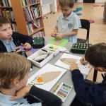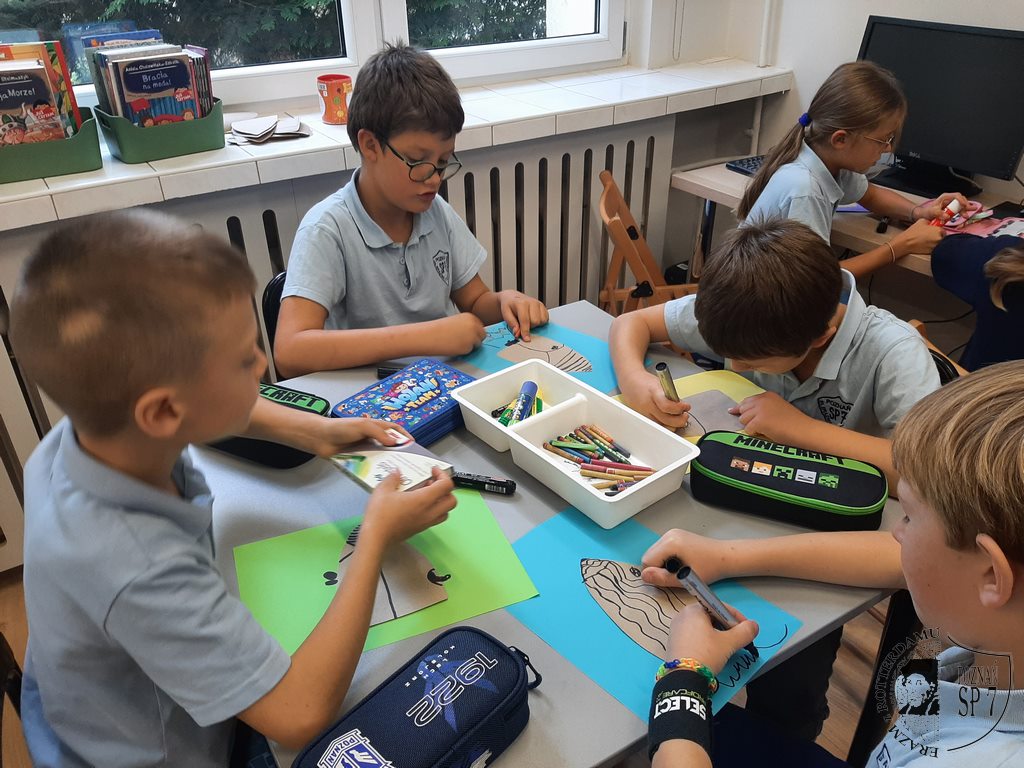 Podczas warsztatów wspólnie z uczniami rozmawialiśmy o tym, jakie uczucia towarzyszyły dziewczynce i jak można rozwiązać jej problem. Następnie dzieci dostały kartki ze śladem spalonego żelazka. Pani Iza poprosiła, by uruchomiły swoją wyobraźnię i stworzyły własne kompozycje z wykorzystaniem śladu po żelazku. Dzieci zrobiły z nich np.: suknię, rakietę kosmiczną, wazon, rybę, mysz… Ciekawych pomysłów było mnóstwo. Prace uczniów można podziwiać na wystawie w naszej bibliotece.