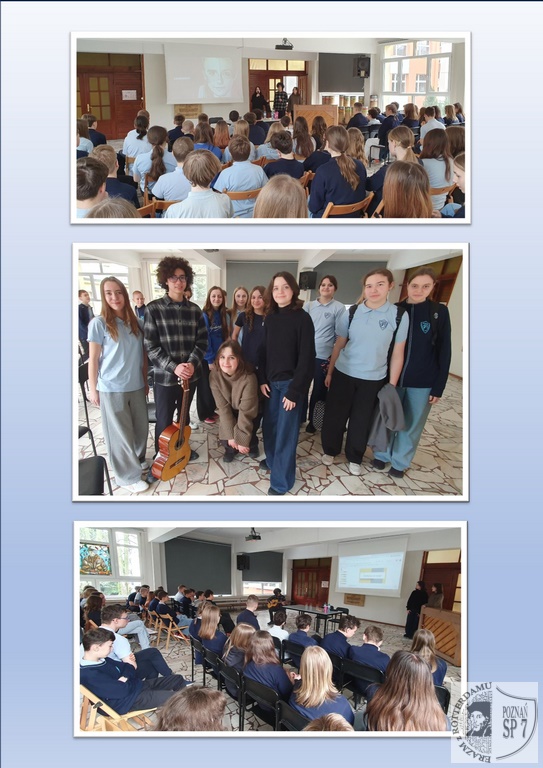 14 marca gościliśmy w naszej szkole troje uczniów z II Liceum Ogólnokształcącego im. Generałowej Zamoyskiej i Heleny Modrzejewskiej w Poznaniu. W ramach olimpiady Zwolnieni z teorii wystąpili oni przed uczniami klas siódmych z prezentacją projektu społecznego własnego autorstwa pod tytułem: Kreatywność i jej wpływ na nasz rozwój. Dzięki niej uczestnicy spotkania dowiedzieli się, czym jest kreatywność i jak ją w sobie rozbudzić. Ponadto, autorzy projektu uświadomili nam, iż zadania twórcze, jak na przykład rysowanie czy gra na instrumencie muzycznym, redukują stres i pozytywnie wpływają na rozwój naszego mózgu: poprawiają zdolność uczenia się, zwiększają koncentrację, a nawet opóźniają proces starzenia się mózgu. Na koniec mogliśmy posłuchać gry na gitarze klasycznej, a chętni uczniowie mogli przyjrzeć się, jak zbudowana jest gitara elektryczna, którą nasi goście przynieśli ze sobą. Spotkanie to było niezwykle pouczające, o czym świadczy świetny kontakt pomiędzy naszymi uczniami a zaproszonymi gośćmi i liczne pytania ze strony widowni. Bardzo dziękujemy Antoninie, Ince oraz Masakiemu, absolwentowi naszej szkoły, za uświadomienie nam wszystkim, jak ważne jest, byśmy nieustannie dbali o nasz rozwój. Życzymy powodzenia w olimpiadzie!