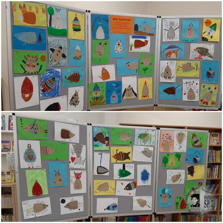 W drugiej części spotkania uczniowie musieli uruchomić wyobraźnię i przekształcić plamę po żelazku w jakiś przedmiot, zwierzę, osobę lub obiekt. Dzieci wykazały się niezwykłą pomysłowością. Ich prace można podziwiać na wystawie znajdującej się w bibliotece.