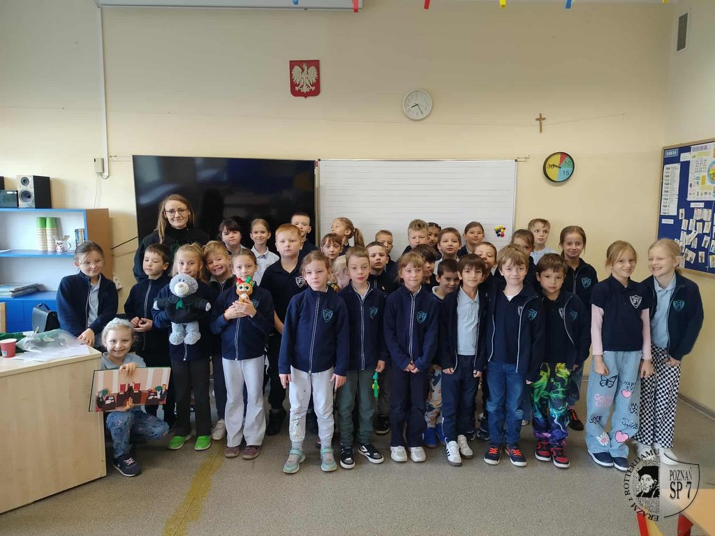 Grupa młodych uczniów i nauczyciel pozują razem w klasie, uśmiechając się do kamery.