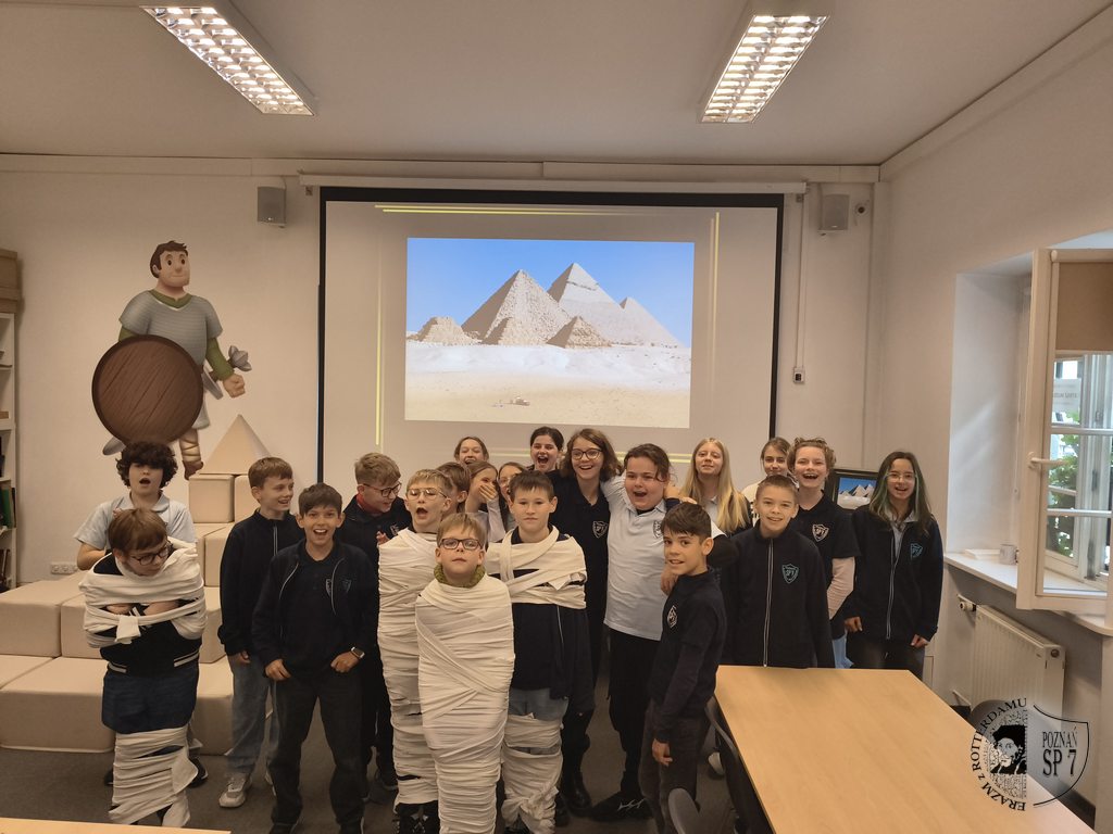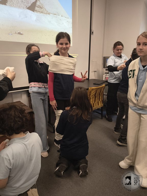 15.10. uczniowie klasy 5b odwiedzili Muzeum Archeologiczne w Poznaniu, aby pogłębić wiedzę na temat wierzeń starożytnych Egipcjan. Dzieci mogły zobaczyć z bliska zabytki kultury starożytnego Egiptu, ale również zrozumieć, jak wyglądała codzienność ludzi żyjących tysiące lat temu. Dużą atrakcją była część warsztatowa, podczas której uczniowie poznali rolę egipskich bogów, szczegółowy proces mumifikacji oraz pracę balsamisty. Na zakończenie pracując w grupach stworzyli mumie. Udział w zajęciach muzealnych był świetną okazją do integracji klasy i rozwijania zainteresowań.