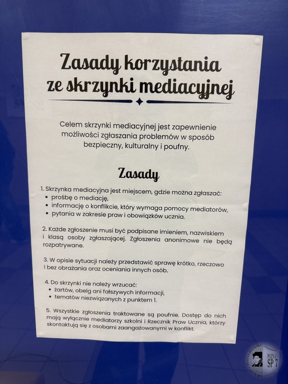 informujemy, że do Waszej dyspozycji została uruchomiona skrzynka mediacyjna, która znajduje się przy sali nr 6. Jest to miejsce w którym możecie podzielić się swoimi problemami, nieporozumieniami lub konfliktami z rówieśnikami. Obok skrzynki znajdziecie zasady korzystania z mediacji oraz krótką instrukcję, jak napisać zgłoszenie. Po wrzuceniu kartki z opisem sytuacji szkolni mediatorzy zajmą się Waszą sprawą w dyskretny i odpowiedzialny sposób. Zachęcamy uczniów do korzystania ze skrzynki mediacyjnej.
