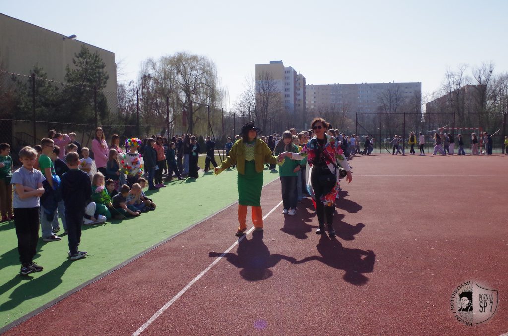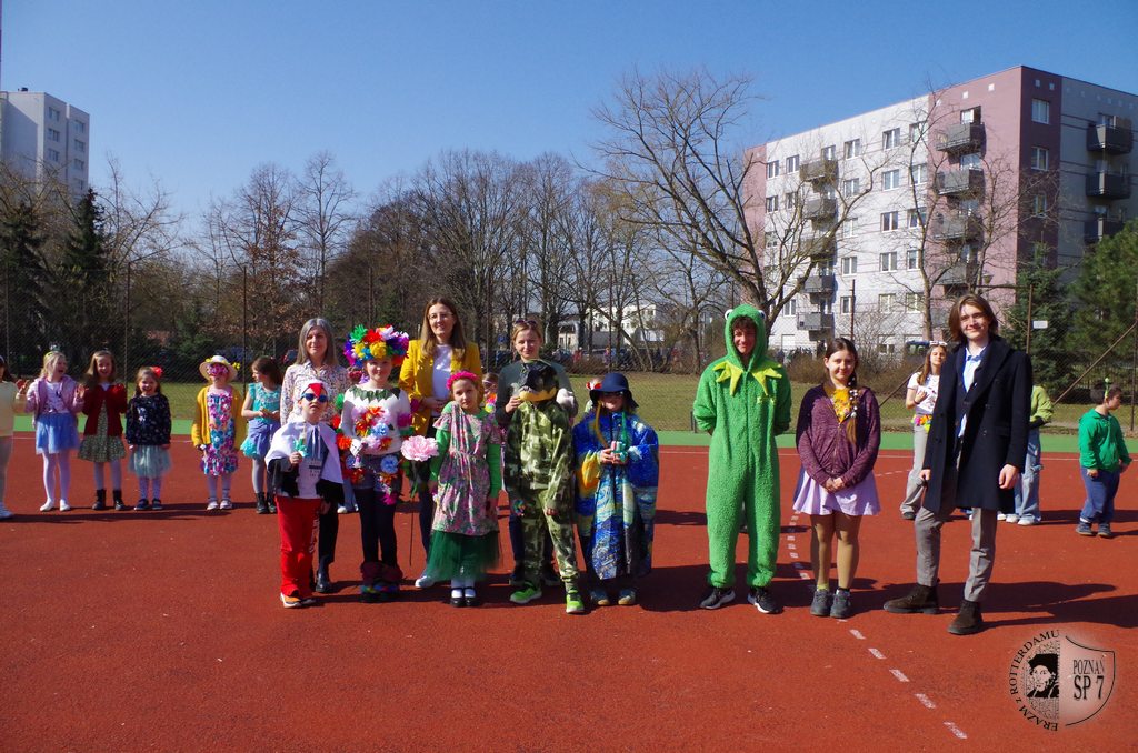 21 marca Mały i Duży Samorząd Uczniowski zaprosiły całą społeczność Siódemki do radosnego powitania pierwszego dnia kalendarzowej wiosny. Wydarzenie odbyło się na szkolnym boisku. Wielu naszych uczniów założyło tego dnia barwne ubrania, symbolizujące rozmaitość kolorów, jakie pojawiają się w przyrodzie wraz z nową porą roku.