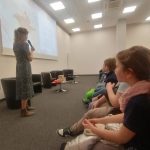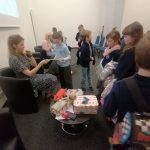 Dowiedzieliśmy się także, co to jest wyklejka w książce oraz jak powstały ilustracje do całej serii. Szukaliśmy różnic w ilustracjach początkowych i końcowych. Wiemy także, co to są nazwiska znaczące, które pojawiają się w tych książkach, jak na przykład Pan Marudko czy Pani Wesołek. Pani Aleksandra pisze również książki o przyjaźni. Jedną z nich jest książka pt. W rytmie serca. Opowieści o dzieciach, które uwierzyły w siebie. W czasie opowieści autorki o tej książce poznaliśmy Tereskę, która lubi tańczyć i my też mogliśmy potańczyć, a tak naprawdę nasze dłonie, którymi poruszaliśmy w rytm muzyki, mając zamknięte oczy. Było to niezapomniane wrażenie. Pisarka przyniosła na spotkanie włóczkowe zwierzaki oraz kolorowe pudełko, do którego mogliśmy wrzucić karteczki z propozycjami, jaki nowy zwierzęcy bohater mógłby pojawić się w kolejnej części ulicy Pazurkowej.