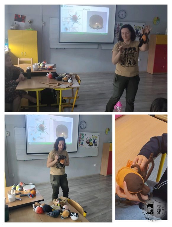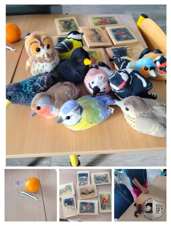 Ważnym punktem spotkania była rozmowa o zagrożeniach, które mogą nas spotkać w lesie kontakt z dzikimi zwierzętami, niemniej jednak naszą uwagę skupiliśmy głównie na kleszczach. Dowiedzieliśmy się, co należy zrobić, aby zminimalizować ryzyko kontaktu z nimi, jak się zachować i co zrobić, gdy kleszcz już nas zaatakuje. W ramach praktyki chętne dzieci samodzielnie i wybraną przez siebie metodą, wcześniej zademonstrowaną nam przez Panią leśnik, mogły usunąć kleszcza z pomarańczy. Nie obyło się również bez wzmianki na temat zachowań człowieka, które w negatywny sposób wpływają na ekosystem leśny (niekontrolowana wycinka lasów, kłusownictwo, pożary czy wyrzucanie śmieci). Na koniec spotkania Pani leśnik przypomniała uczniom o zasadach właściwego zachowania się w lesie, o konieczności zachowania ciszy i zastanego w nim porządku. Ciekawym akcentem warsztatów były maskotki – ptaki, które wyglądem i wydawanym przez siebie śpiewem imitowały realne ptaki. Dzięki nim w warunkach klasowych mogliśmy poczuć się jak w lesie. Spotkanie upłynęło w miłej atmosferze a wysłuchane ciekawostki i wiadomości poszerzyły wiedzę przyrodniczą uczniów.