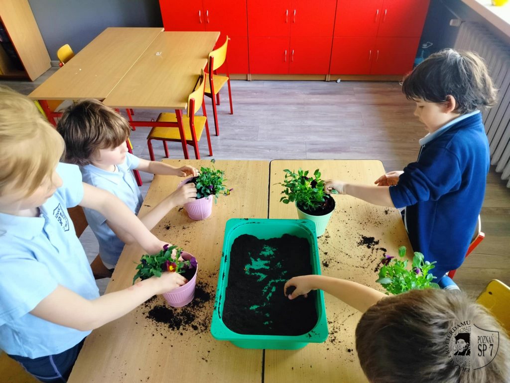 Czwórka małych dzieci zgromadziła się wokół stołu, sadząc rośliny w kolorowych doniczkach. Na stole rozrzucona jest ziemia, a na środku zielona taca wypełniona ziemią. W tle widać czerwone szafki i drewniane meble.