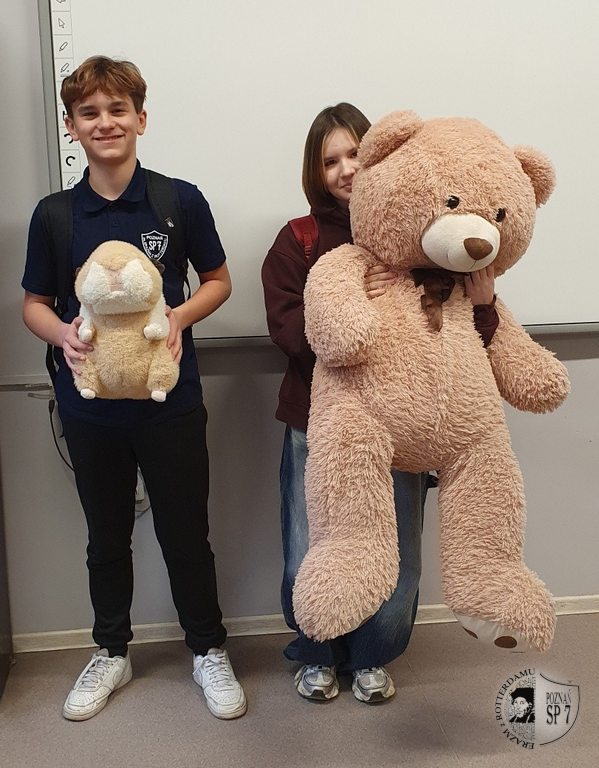 Tego dnia także uczniowie Siódemki przynieśli do szkoły swoje pluszowe zabawki. Widok tak małych, jak i dużych dzieci, ściskających ukochane kapibary, kaczki, miśki, chomiki i inne przytulanki, w każdym z nas wywoływał uśmiech i wprawiał w miły nastrój. Obchody Dnia Pluszowego Misia przypomniały wszystkim, że nawet w świecie pełnym nowoczesnych technologii pluszowy miś nadal pozostaje symbolem ciepła, bezpieczeństwa i dziecięcej radości. To święto było okazją do wzmacniania więzi między uczniami, rozwijania kreatywności oraz wspólnej, pełnej uśmiechu zabawy.