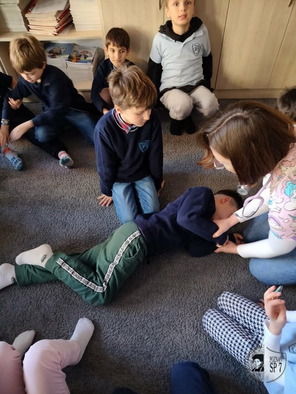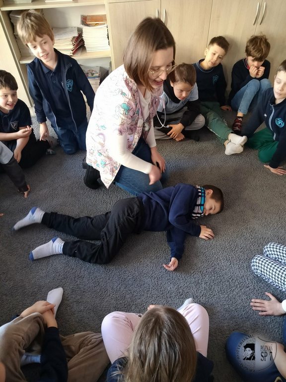Druga część spotkania była poświęcona podstawowym zasadom pierwszej pomocy. Pediatra wytłumaczył dzieciom, jak reagować w sytuacjach nagłych, jak bezpiecznie wezwać pomoc oraz dlaczego należy zachować spokój. W trakcie zajęć praktycznych uczniowie nauczyli się podstaw prawidłowego sprawdzania przytomności, oceniania oddechu oraz poznali schemat wzywania numerów alarmowych. Ponadto pediatra pokazał naszym drugoklasistom, jak prawidłowo ułożyć osobę w pozycji bezpiecznej. Następnie chętne dzieci miały okazję poćwiczyć na koleżance lub koledze ułożenie w pozycji bocznej ustalonej.