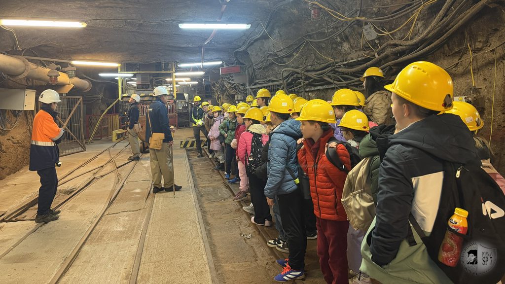Dzieci w żółtych kaskach stoją w kolejce, słuchając przewodników wewnątrz podziemnego tunelu lub kopalni.