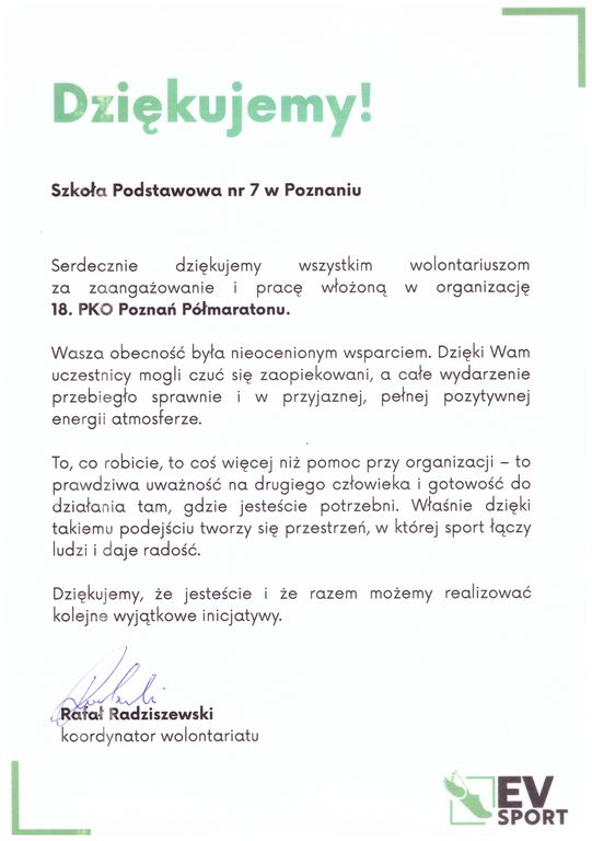 Jesteśmy dumni z naszych wolontariuszy, których obecność była nieocenionym wsparciem dla tysięcy biegaczy. Dziękujemy za każdą minutę poświęconego czasu, za uśmiech i profesjonalizm. Takie inicjatywy pokazują, że razem możemy realizować wyjątkowe rzeczy.
