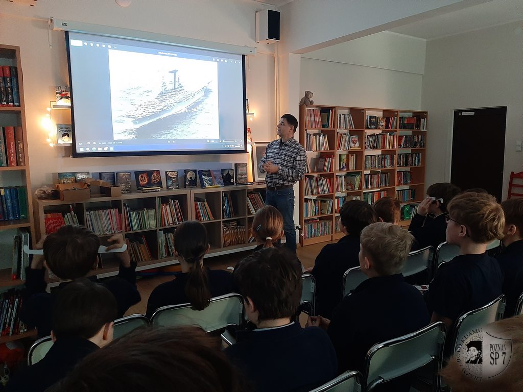 W dniach 4 i 11 marca Siódemkę odwiedził znany i ceniony poznański grafik komputerowy – pan Waldemar Góralski. Nasz gość spotkał się z uczniami klas 5c i 6a, by podzielić się wiedzą na temat okrętów wojennych. Dowiedzieliśmy się, że pan Waldemar posiada w swoich zbiorach sporą kolekcję zdjęć, dokumentów i około 6 tys. książek poświęconych temu zagadnieniu. Przez ponad 20 lat samodzielnie uczył się tworzenia grafik komputerowych i rysowania okrętów w formacie trójwymiarowym. Waldemar Góralski jest autorem kilkudziesięciu książek, a jego prace można podziwiać na wystawach organizowanych w wielu polskich miastach.