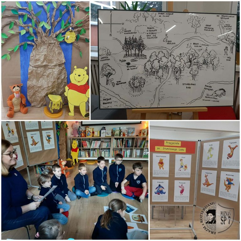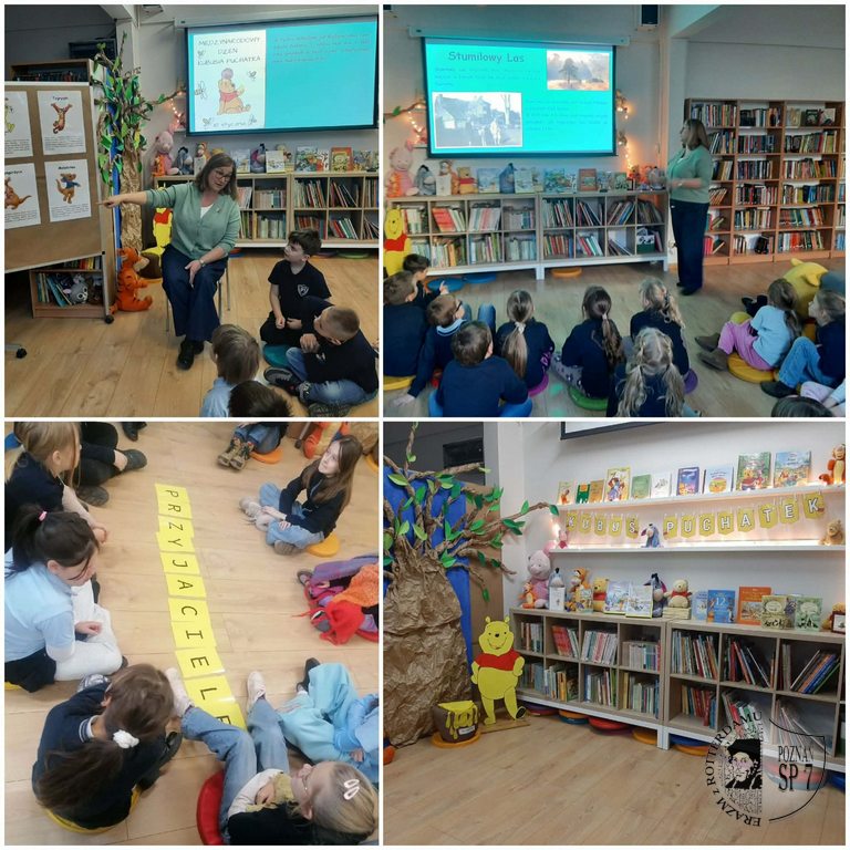 Podczas warsztatów uczniowie klas 1-3 poznali prawdziwą historię Kubusia Puchatka, która rozpoczęła się ponad 100 lat temu w dalekiej Kanadzie. Dzieci nauczyły się śpiewać ulubioną mruczankę Puchatka i rozwiązywały zagadki na temat przyjaciół ze Stumilowego Lasu. Uczniowie uważnie wysłuchali opowiadania pt. „Uwierz w siebie”. Poznana historia stała się inspiracją do rozmowy o uczuciach i sposobach radzenia sobie w trudnych sytuacjach. Uczestnicy warsztatów posługiwali się mapą, przypominając sobie przy okazji główne i pośrednie kierunki geograficzne.