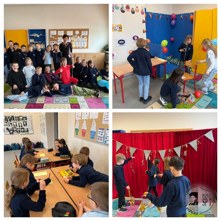 Kolaż dzieci w klasach i grających w gry, z kolorowymi dekoracjami i rekwizytami.