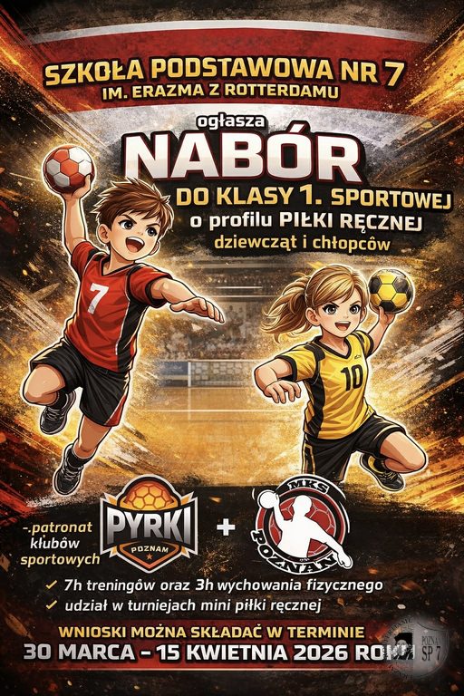 - 21.04.2026r. godz. 12:00 – Podanie do publicznej wiadomości przez komisję rekrutacyjną listy kandydatów, którzy uzyskali pozytywne wyniki prób sprawności fizycznej, o których mowa w art. 137 ust. 1 pkt. 3 ustawy Prawo Oświatowe (wynik pozytywny z prób sprawnościowych nie jest jednoznaczny z przyjęciem do oddziału sportowego).